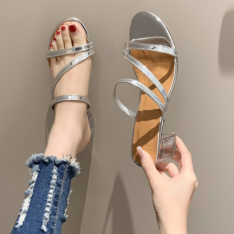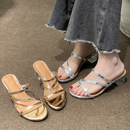 拖鞋女夏时尚外穿百搭银色粗跟高跟鞋透明水晶外贸大码罗马凉鞋潮