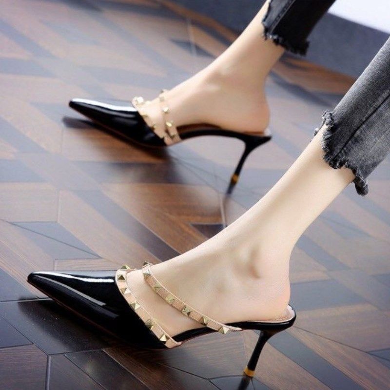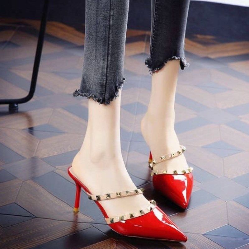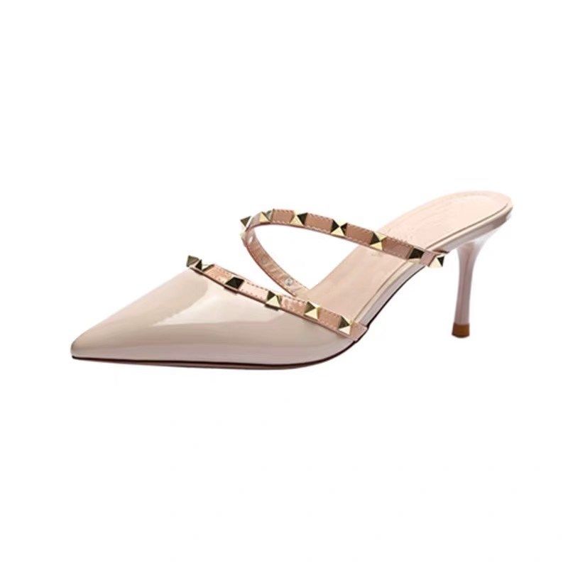 包头凉拖鞋女夏外穿尖头半拖鞋网红时尚铆钉高跟鞋细跟小码313233