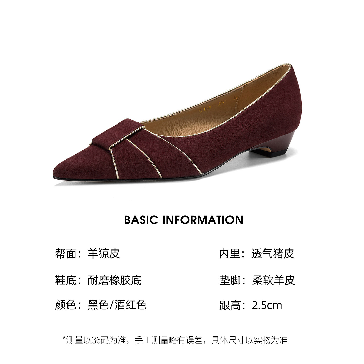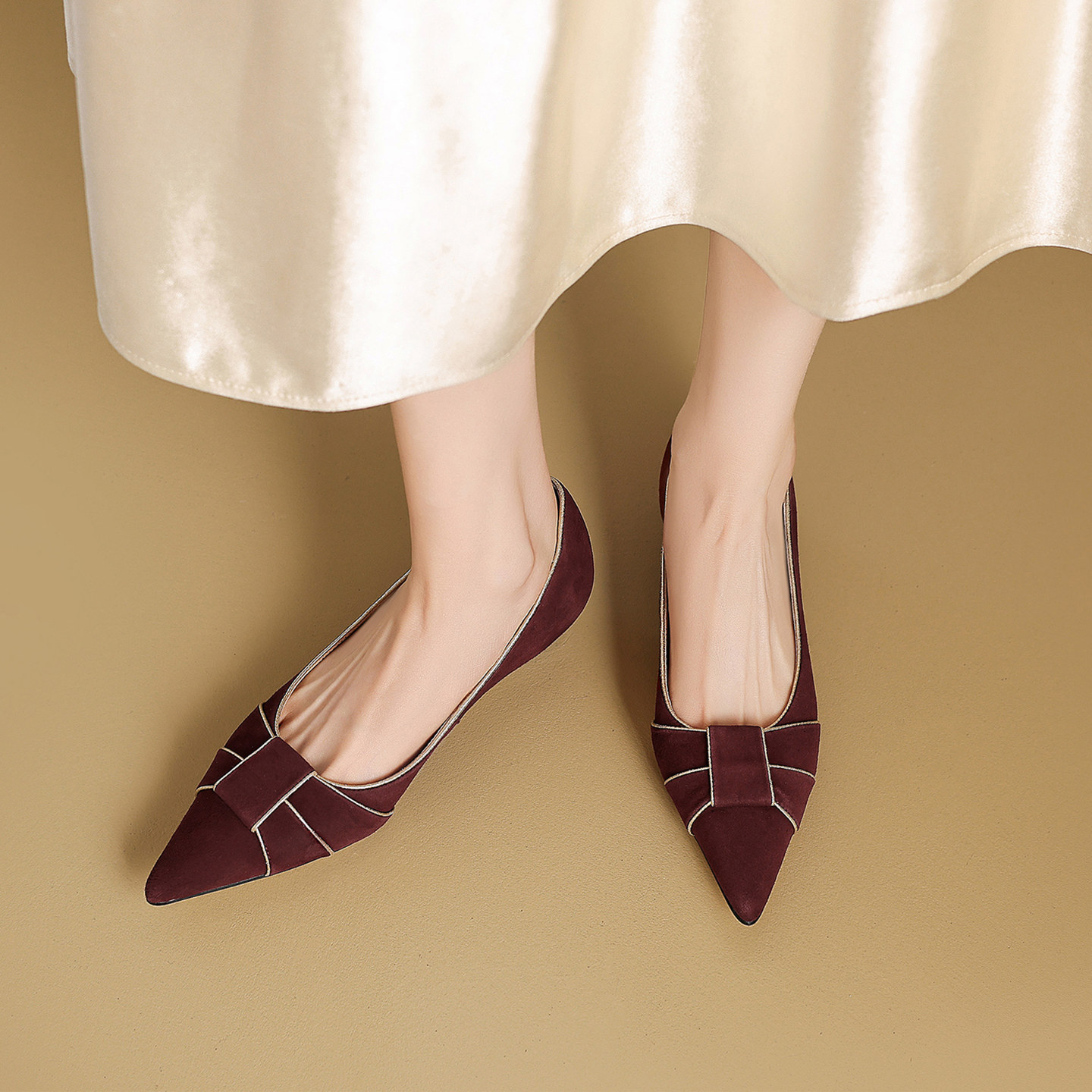 精致拼色蝴蝶结绒面羊皮舒适低跟浅口单鞋尖头坡跟一脚蹬真皮女鞋