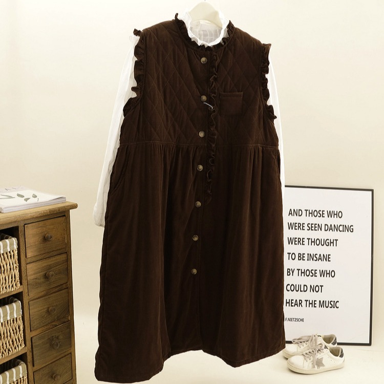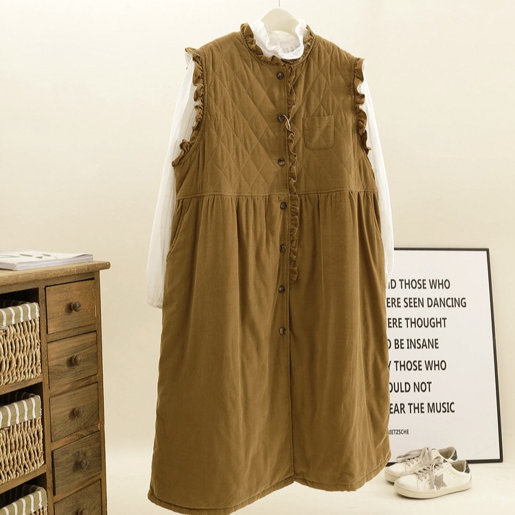 森系冬季温暖灯芯绒夹棉加厚连衣裙复古高腰显瘦无袖背心裙长裙子