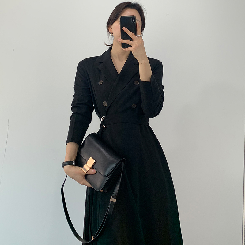 韩国chic极简主义 气质西装领双排扣系带收腰显瘦长袖百褶连衣裙