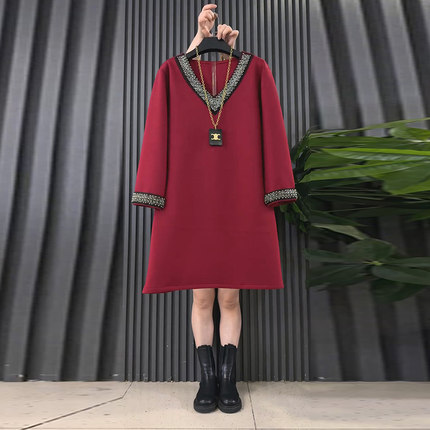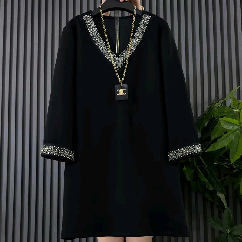 新款气质V领时尚钉珠遮肉休闲大衫大码女装胖mm设计感中长款上衣