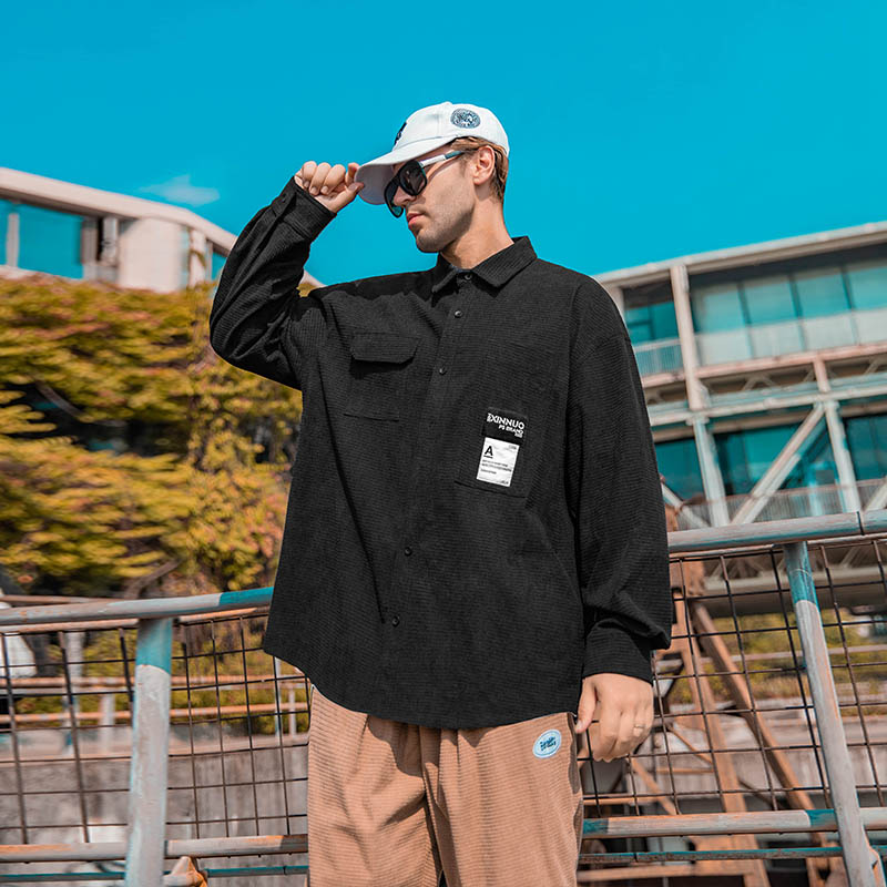 纺布者潮牌春秋胖子加大休闲衬衣灯芯绒宽松大码长袖衬衫男秋装