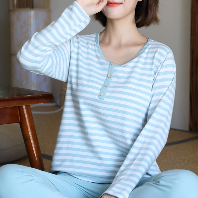 女秋冬款纯棉条纹长袖T恤宽松大码睡衣打底衫家居服外穿上衣秋衣