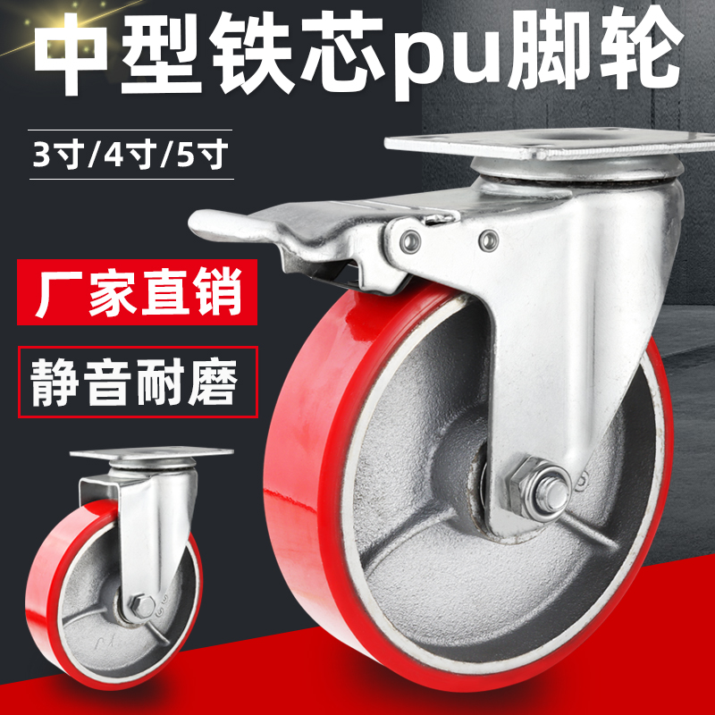 中型3寸铁芯pu轮4寸万向轮5寸铁芯聚氨酯脚轮超耐磨铸铁芯推车轮