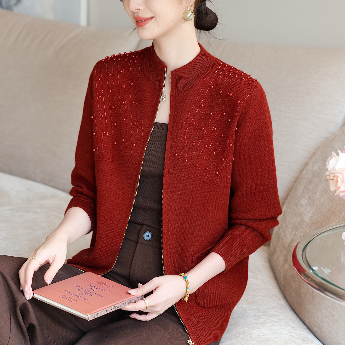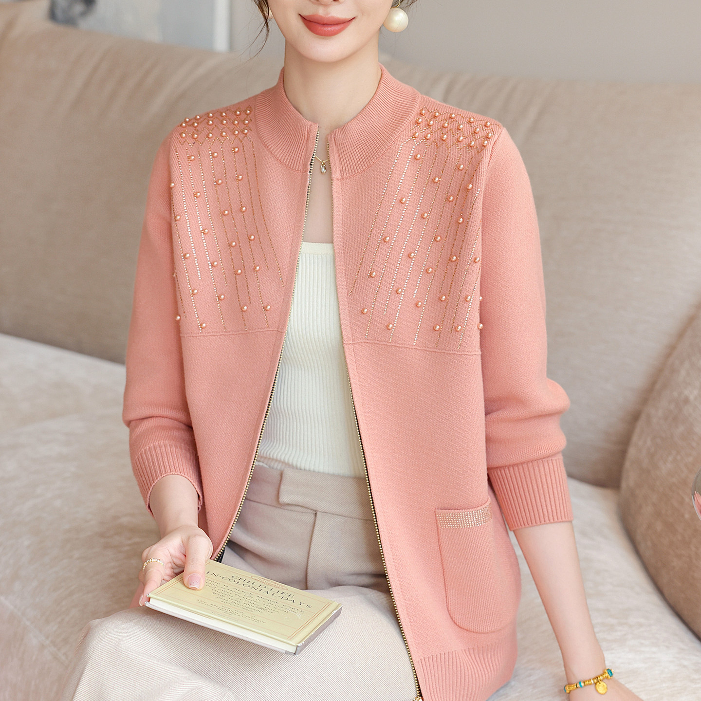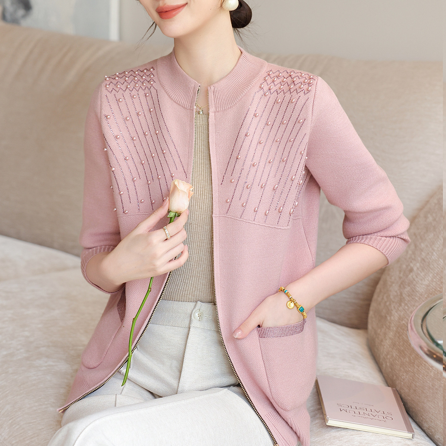 秋装针织开衫中老年春秋钉珠外套