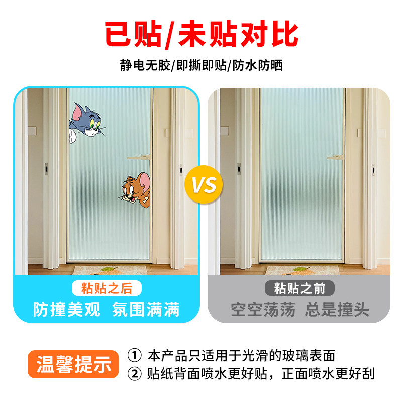 卡通猫和老鼠卫生间推拉门玻璃贴纸浴室防撞贴小心提示贴静电贴画