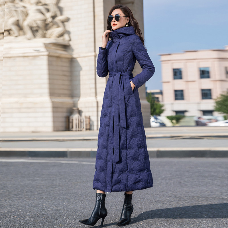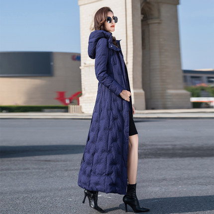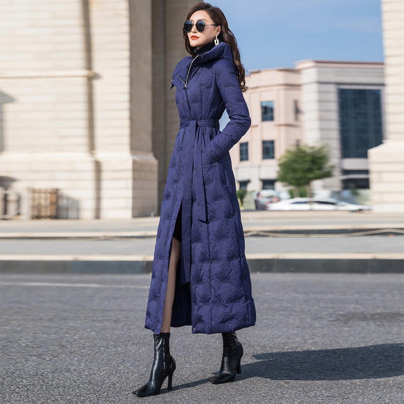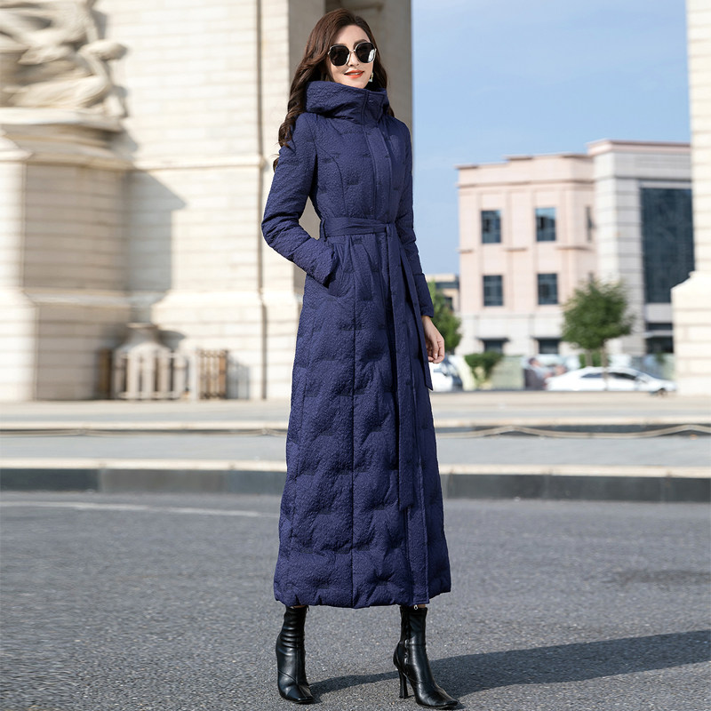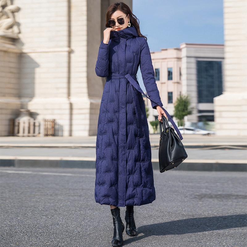 羽绒服女2024年新款蓝色长款修身过膝白鸭绒加厚外套超长到脚踝