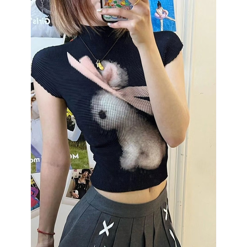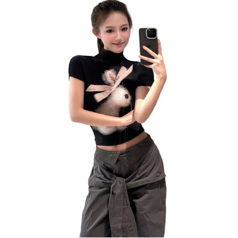 大码甜酷妹涂鸦蝴蝶结小兔短袖t恤女夏季修身褶皱设计感百搭上衣
