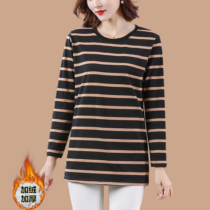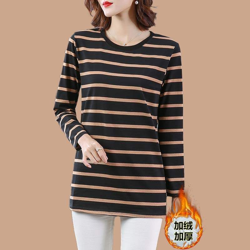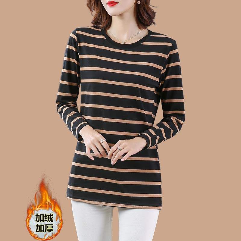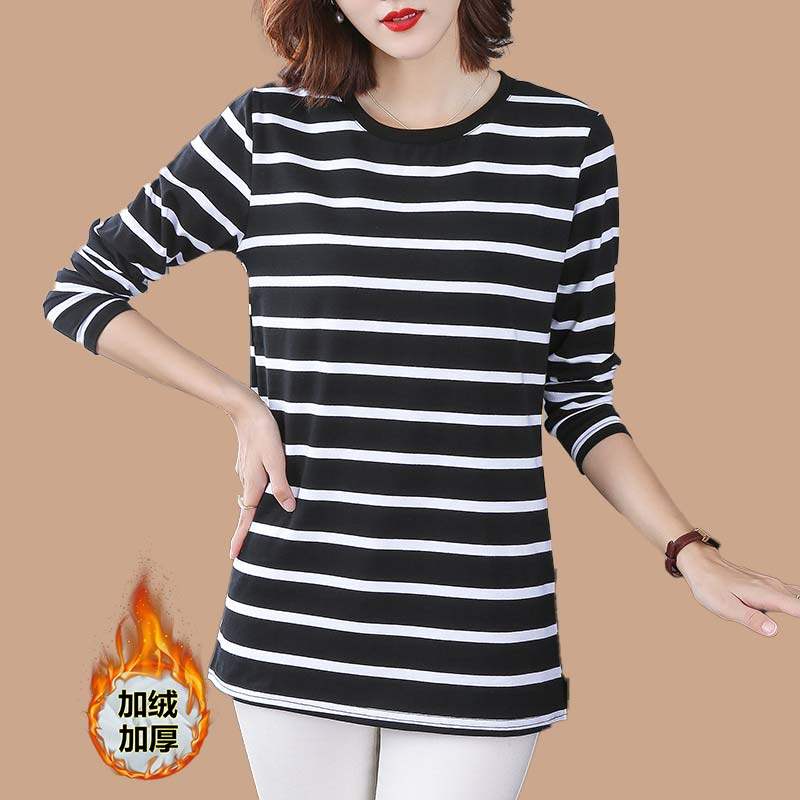 秋季纯棉长袖t恤女装中长款加绒加厚打底衫大码宽松冬款内搭保暖