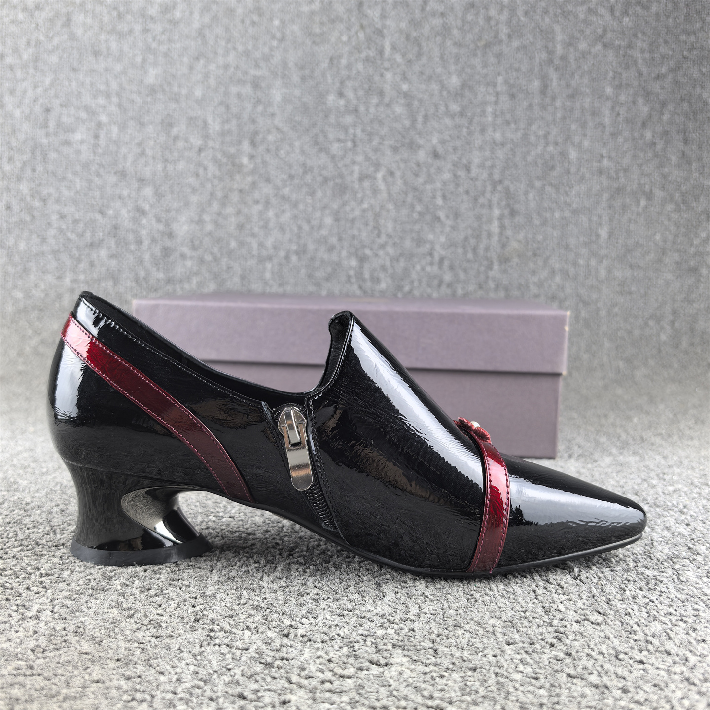 36码处理牛漆皮民族风深口单鞋女春秋新款尖头中跟真皮女鞋侧拉链