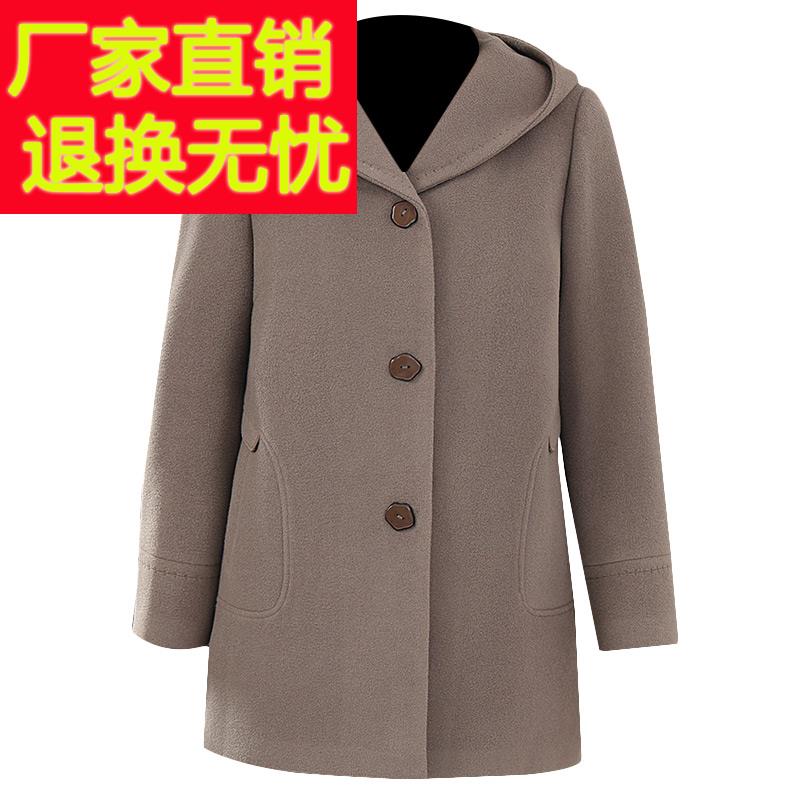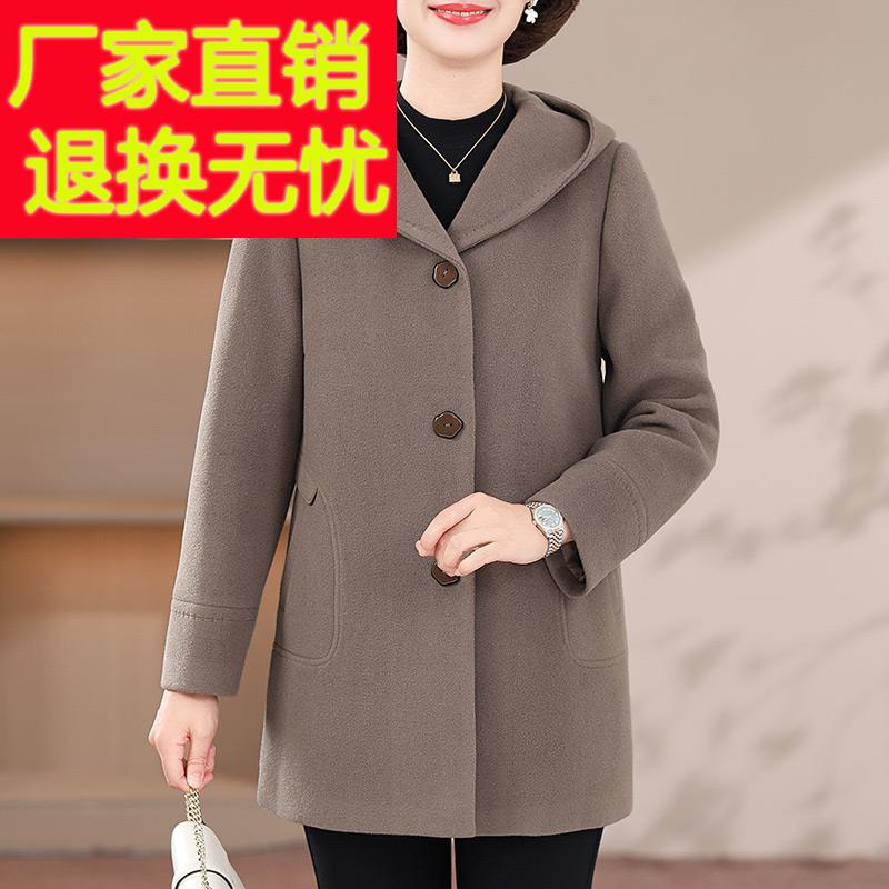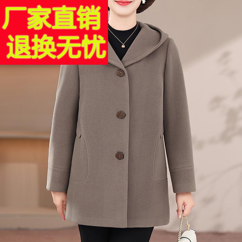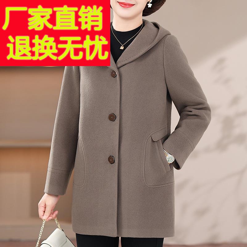 妈妈秋冬新款高贵连帽毛呢子大衣中年妇女中长上衣中老年冬装外套