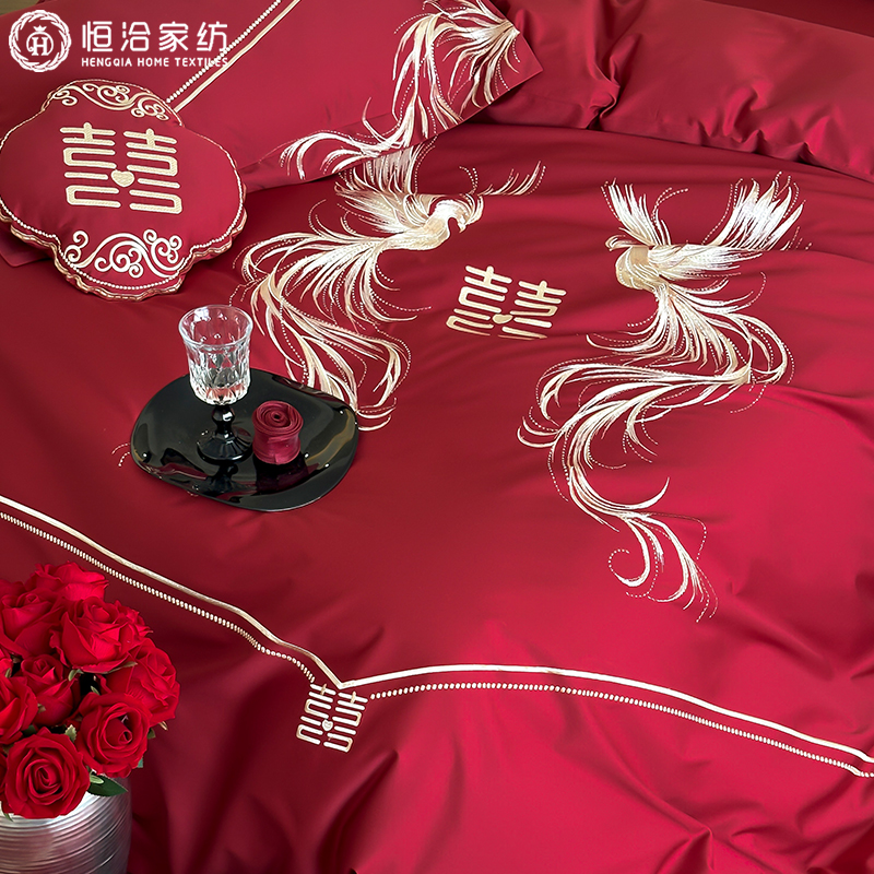新中式婚庆全棉四件套超柔龙凤刺绣红色结婚纯棉被套床上用品婚嫁