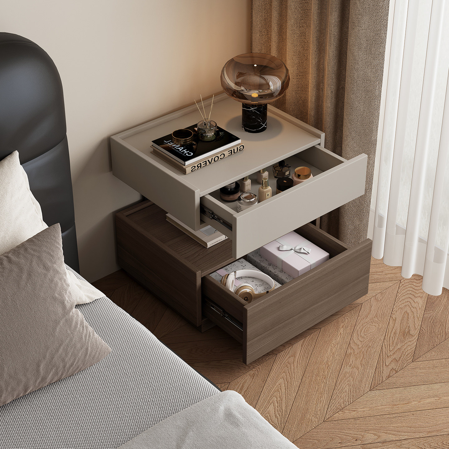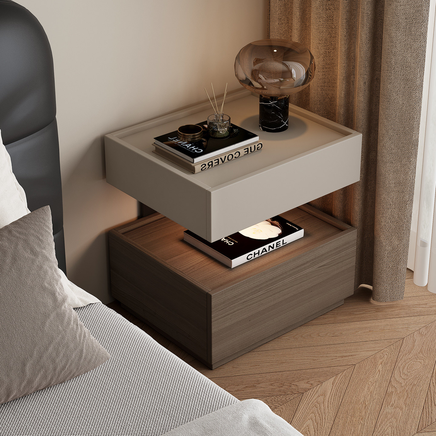 语木小森现代简约悬浮带灯暗格床头柜实木收纳柜轻奢卧室床边柜