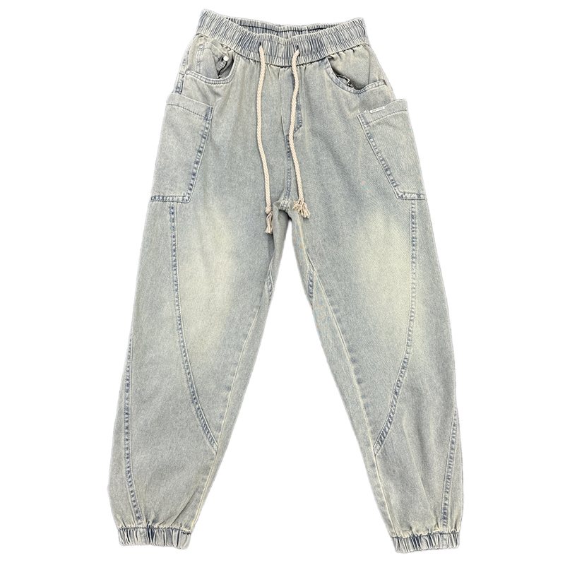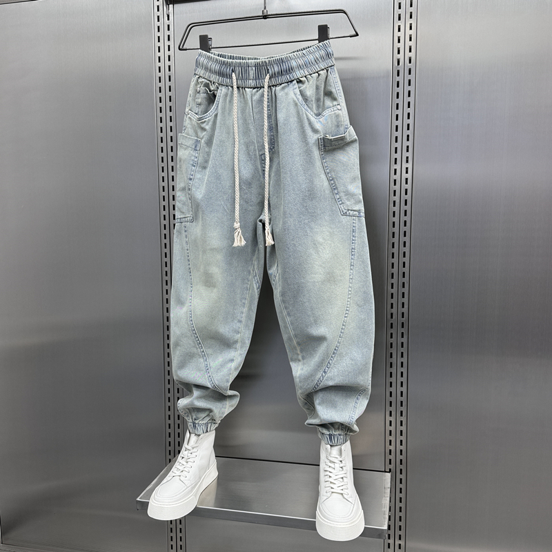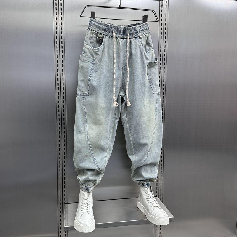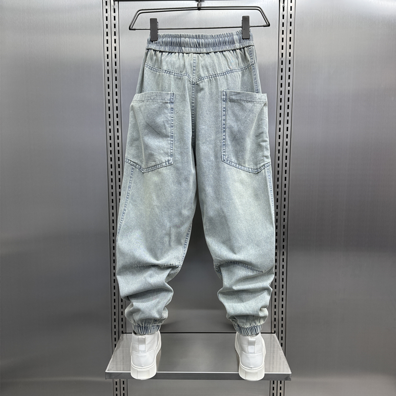 牛仔裤男士2024夏季薄款多口袋宽松束脚裤青年水洗复古九分哈伦裤