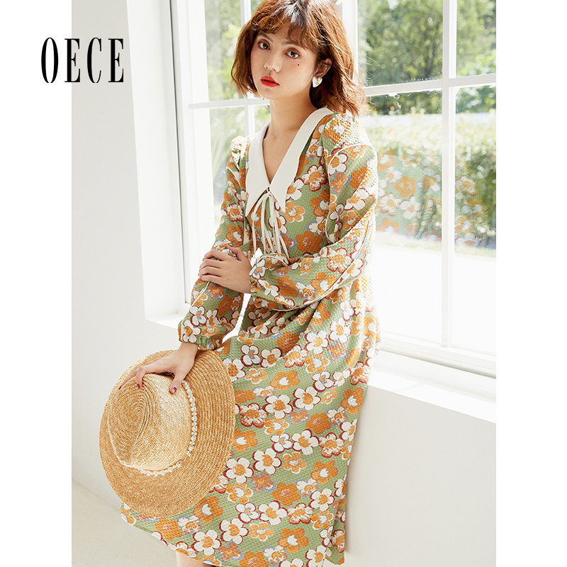 Oece复古碎花裙子春秋新款女装法式气质收腰长袖连衣裙