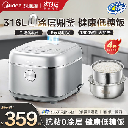 美的低糖0涂层电饭煲家用3到4人316L不锈钢鼎釜锅4升官方正品旗舰