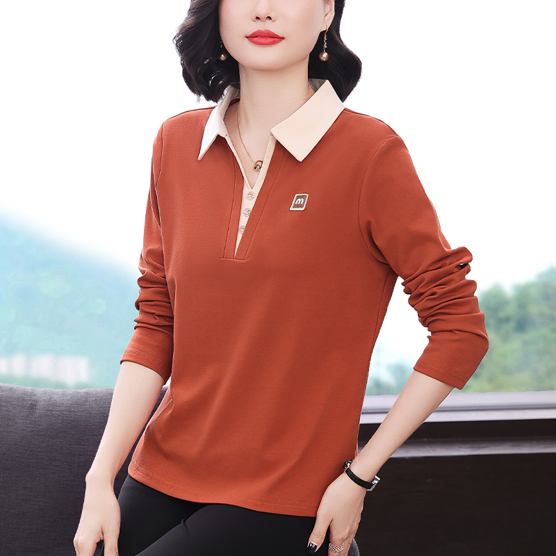 妈妈秋季新款纯棉长袖翻领拼色T恤衫中老年减龄宽松女上衣打底衫