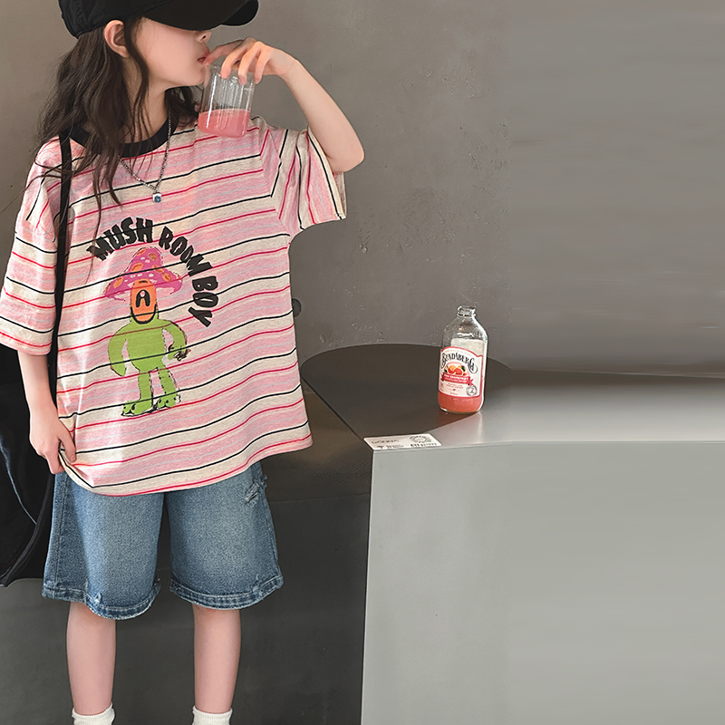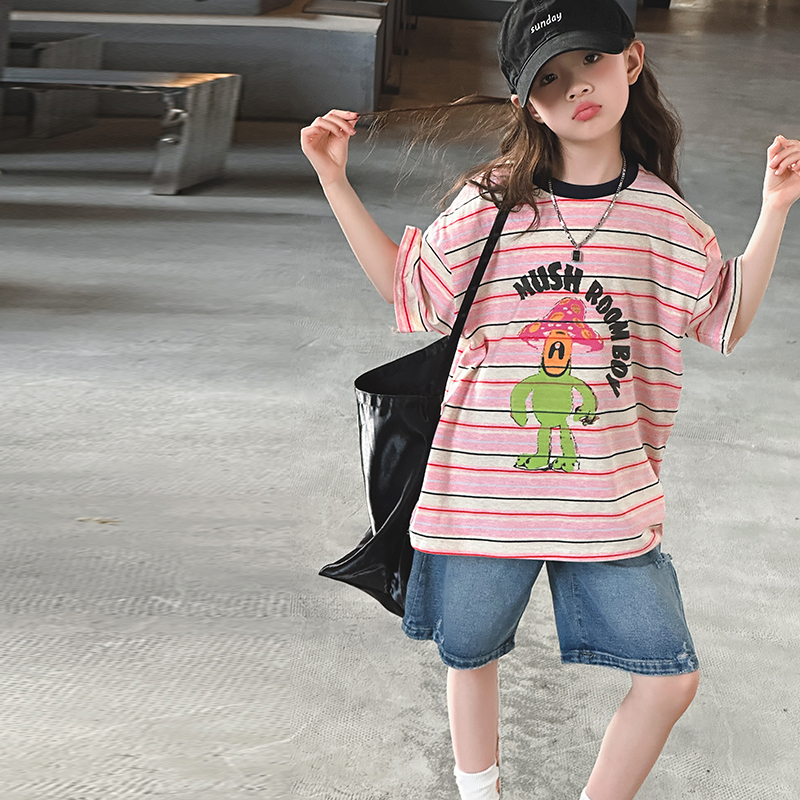 女童短袖t恤夏季2025新款儿童洋气时髦夏装大童纯棉条纹打底上衣