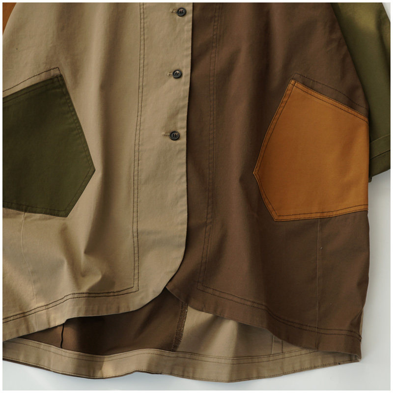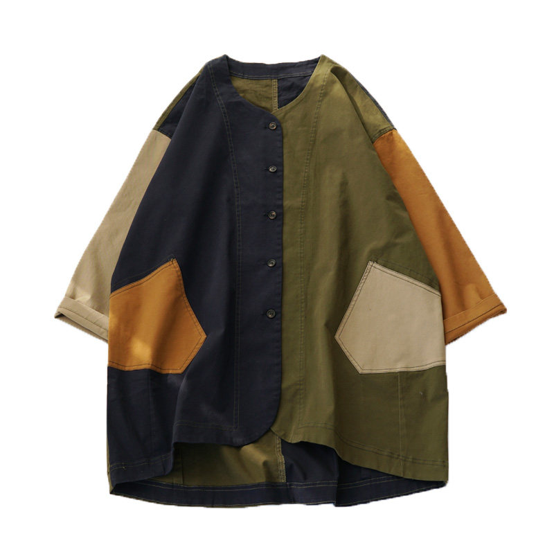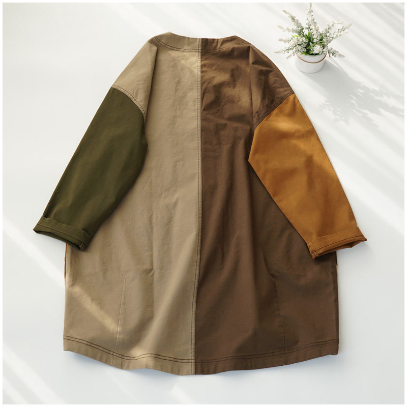 春季新款 复古小众撞色拼接中长款风衣 宽松日系V领单排扣外套女