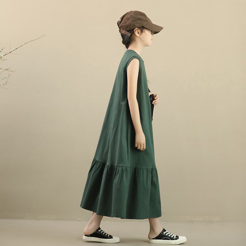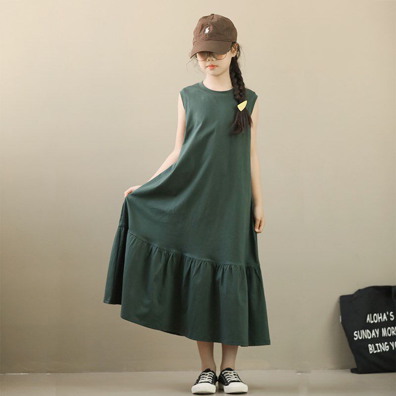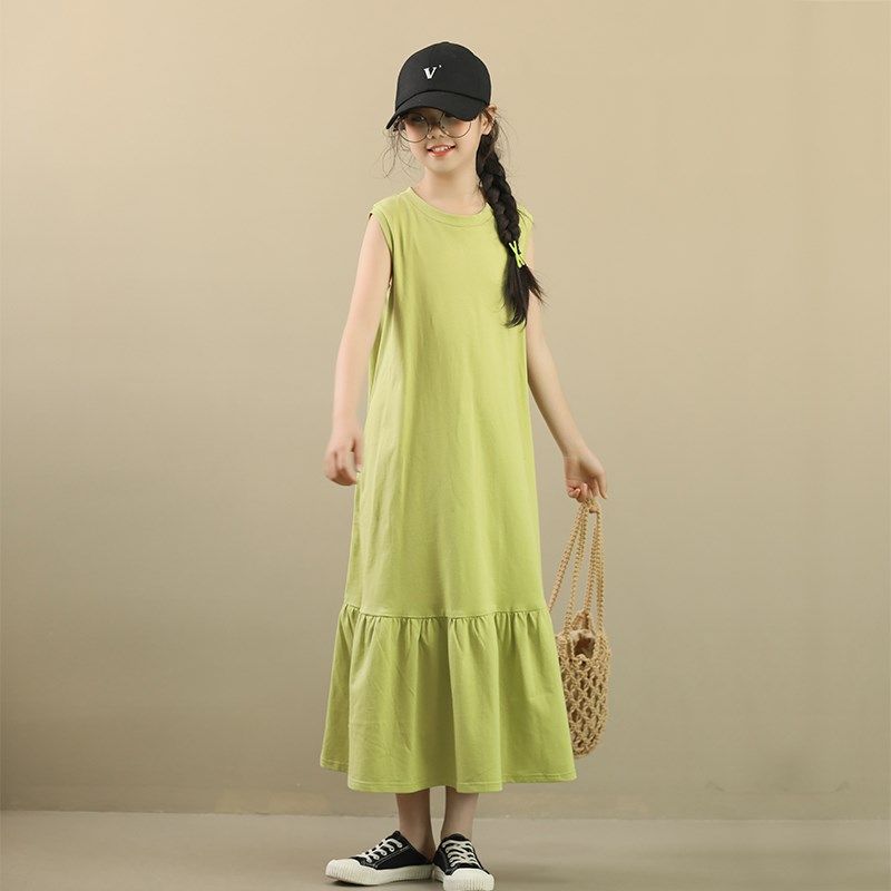 女大童连衣裙夏装纯棉背心裙宽松荷叶边裙子女孩亲子度假休闲长裙