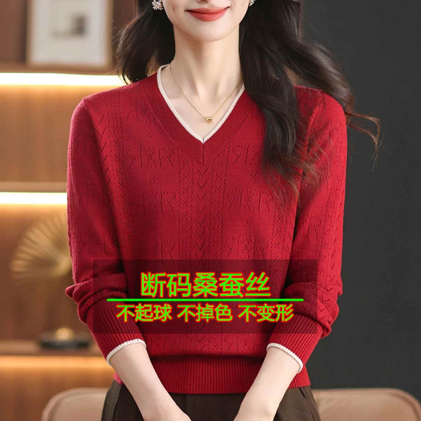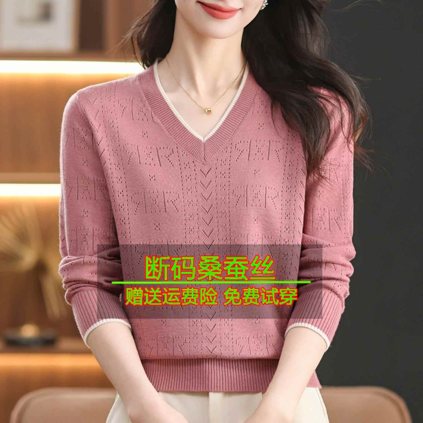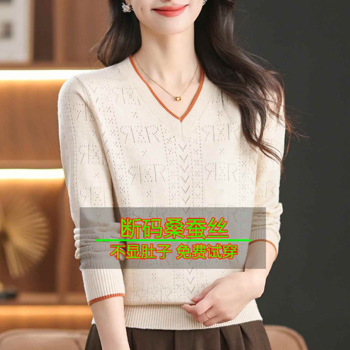 桑蚕丝长袖t恤女针织V领宽松上衣秋装妈妈减龄漂亮洋气打底小衫薄