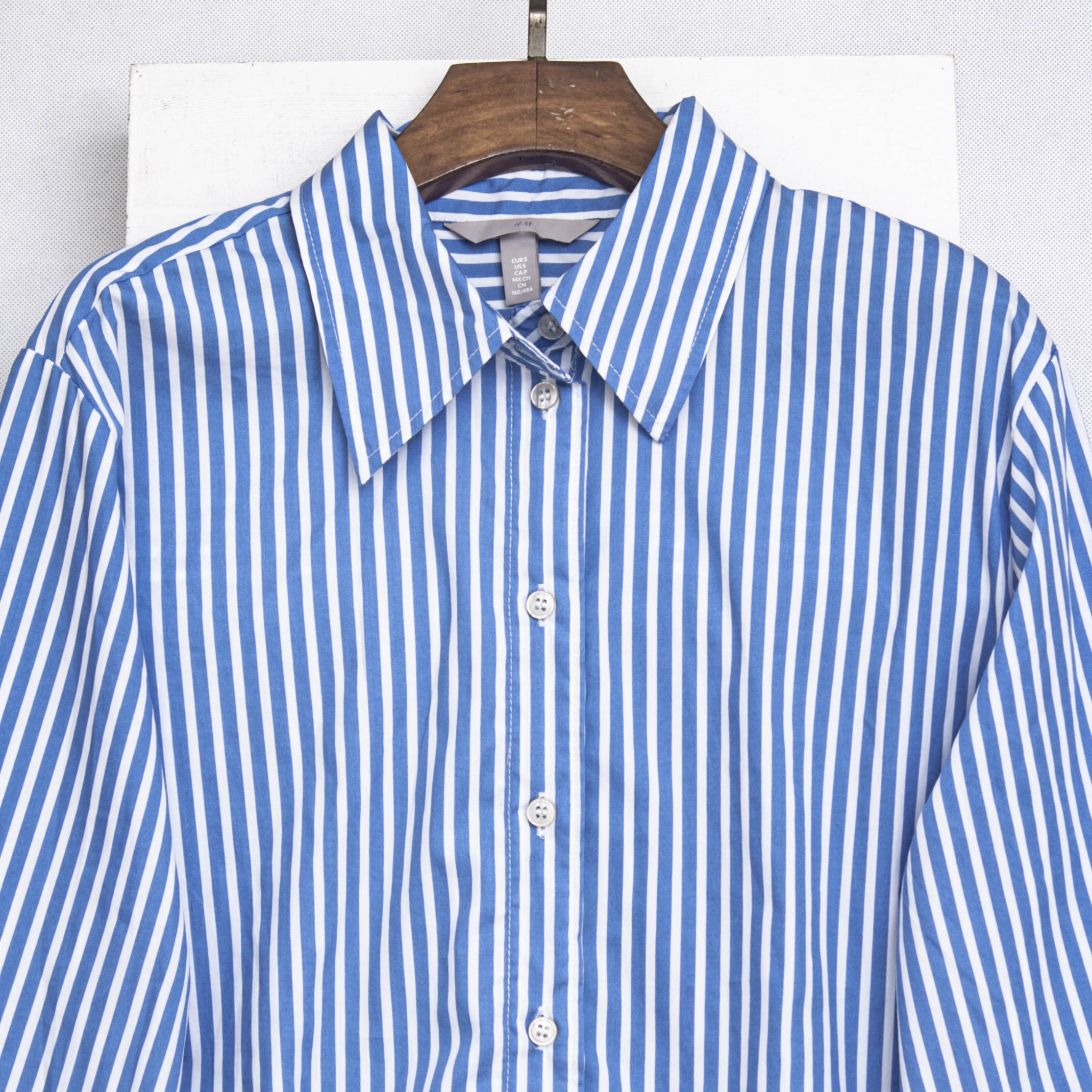 外贸单 蓝白竖条纹衬衫女 设计感翻领长袖纯棉衬衣 百搭小众上衣