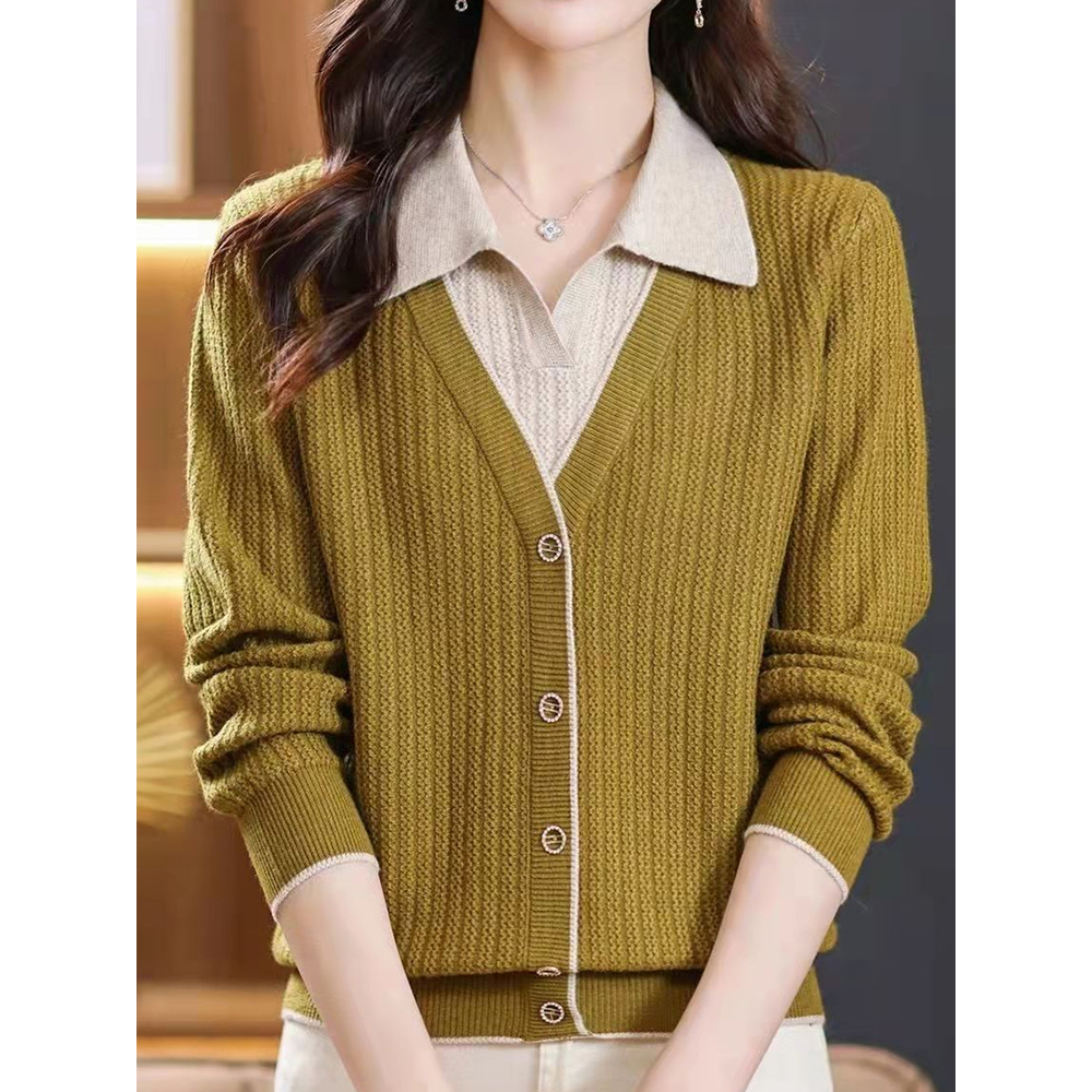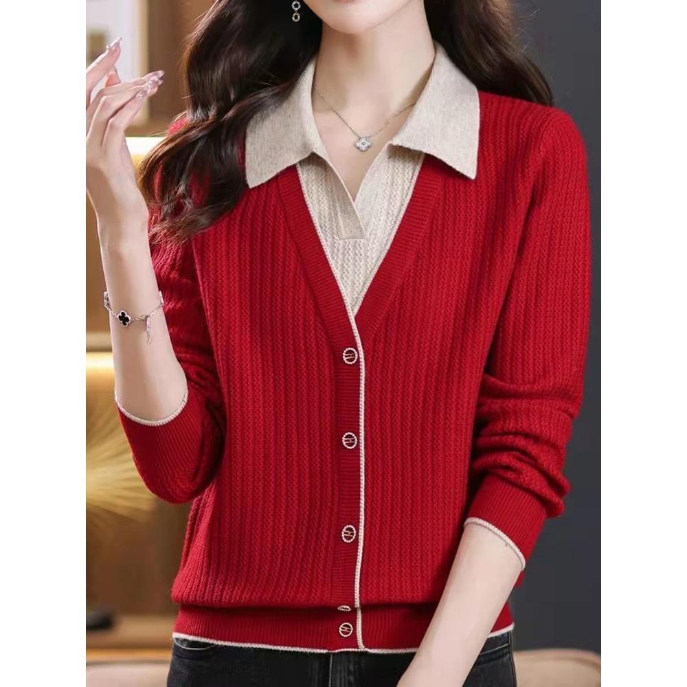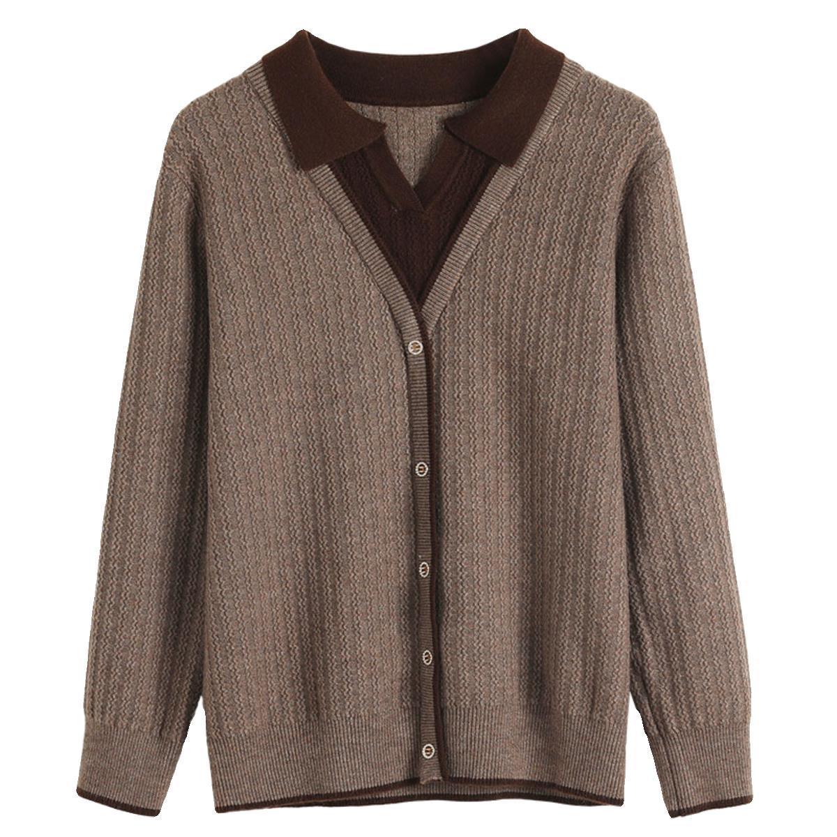 2024中年女士翻领假两件针织衫