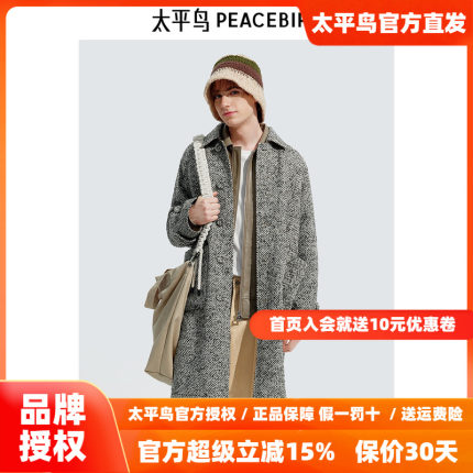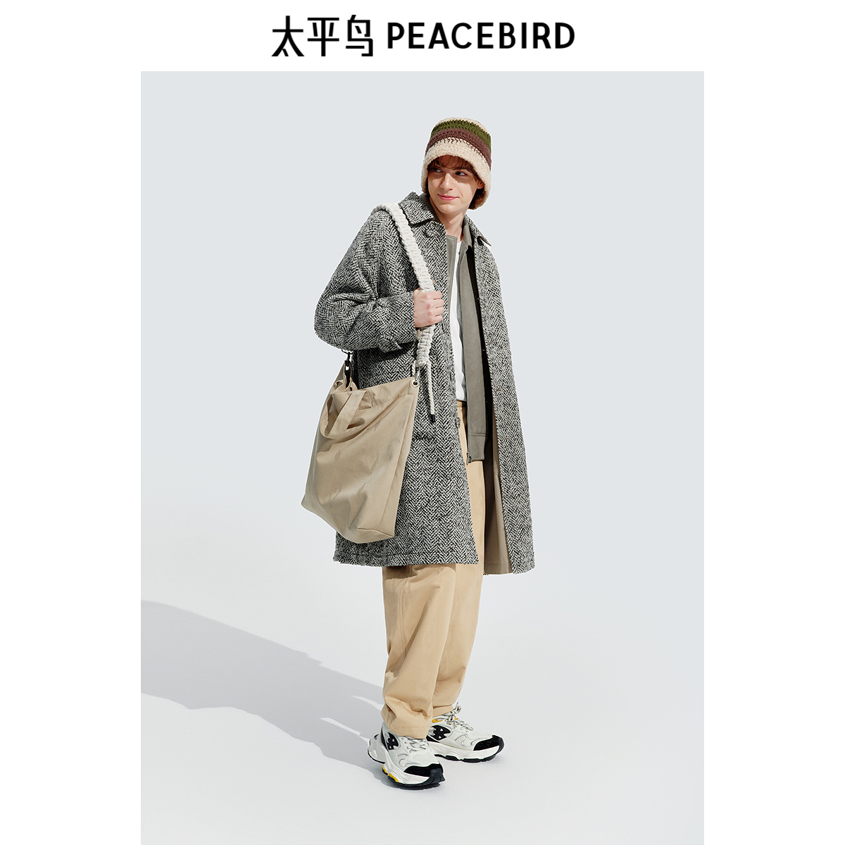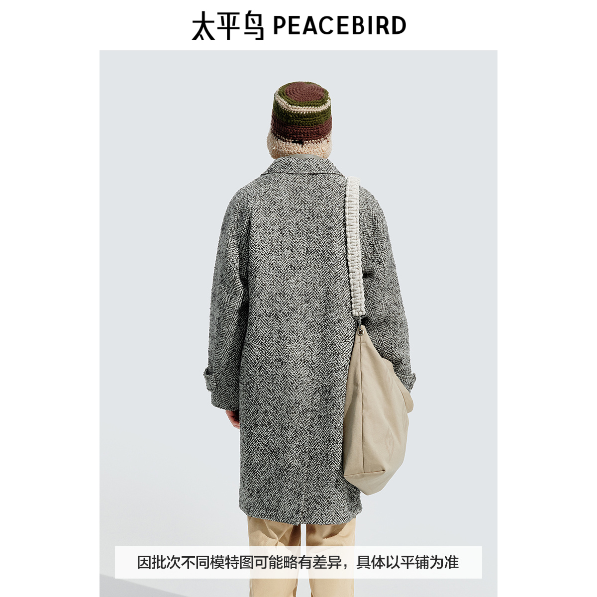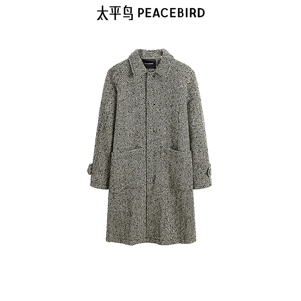 【商场同款】太平鸟男装人字纹毛呢大衣长款羊毛外套潮B2AAE4162