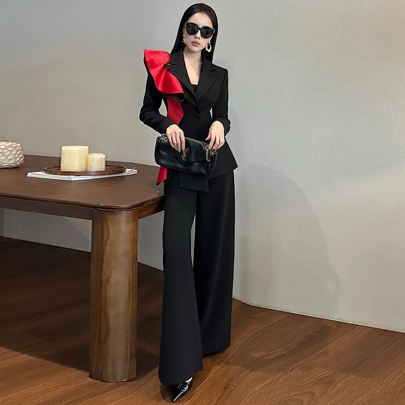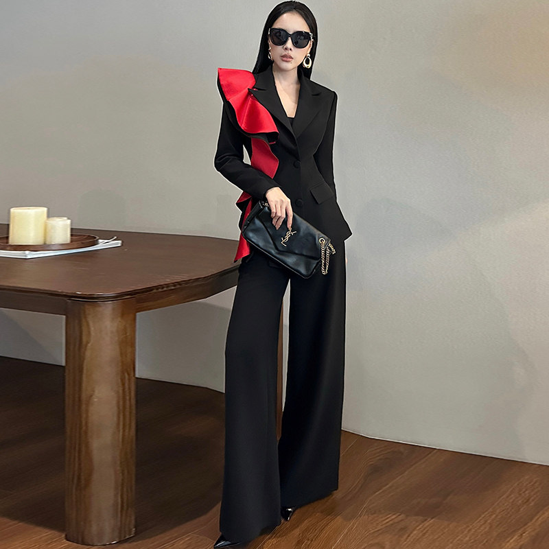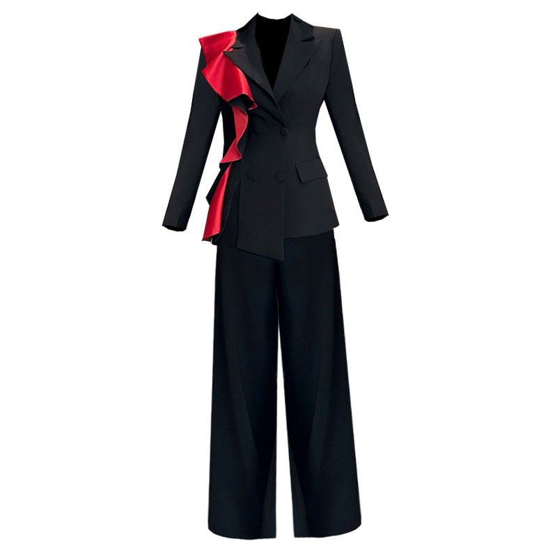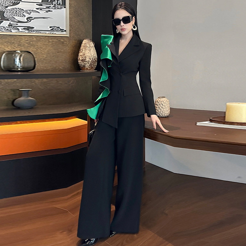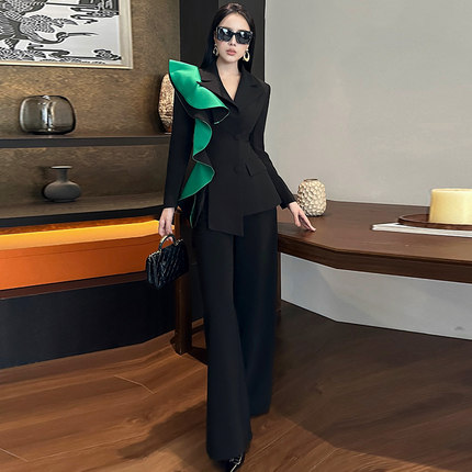 时尚拼色荷叶边修身长袖西装高腰阔腿长裤重要场合漂亮套装女秋冬