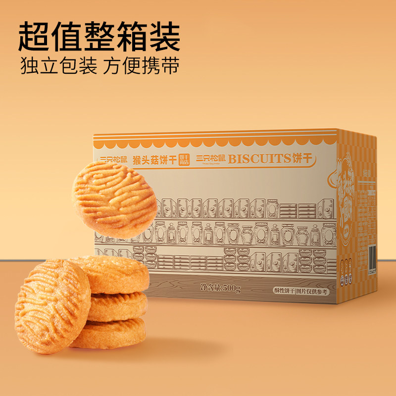 三只松鼠猴头菇小圆饼500g营养健康早餐办公室网红解馋休闲零食