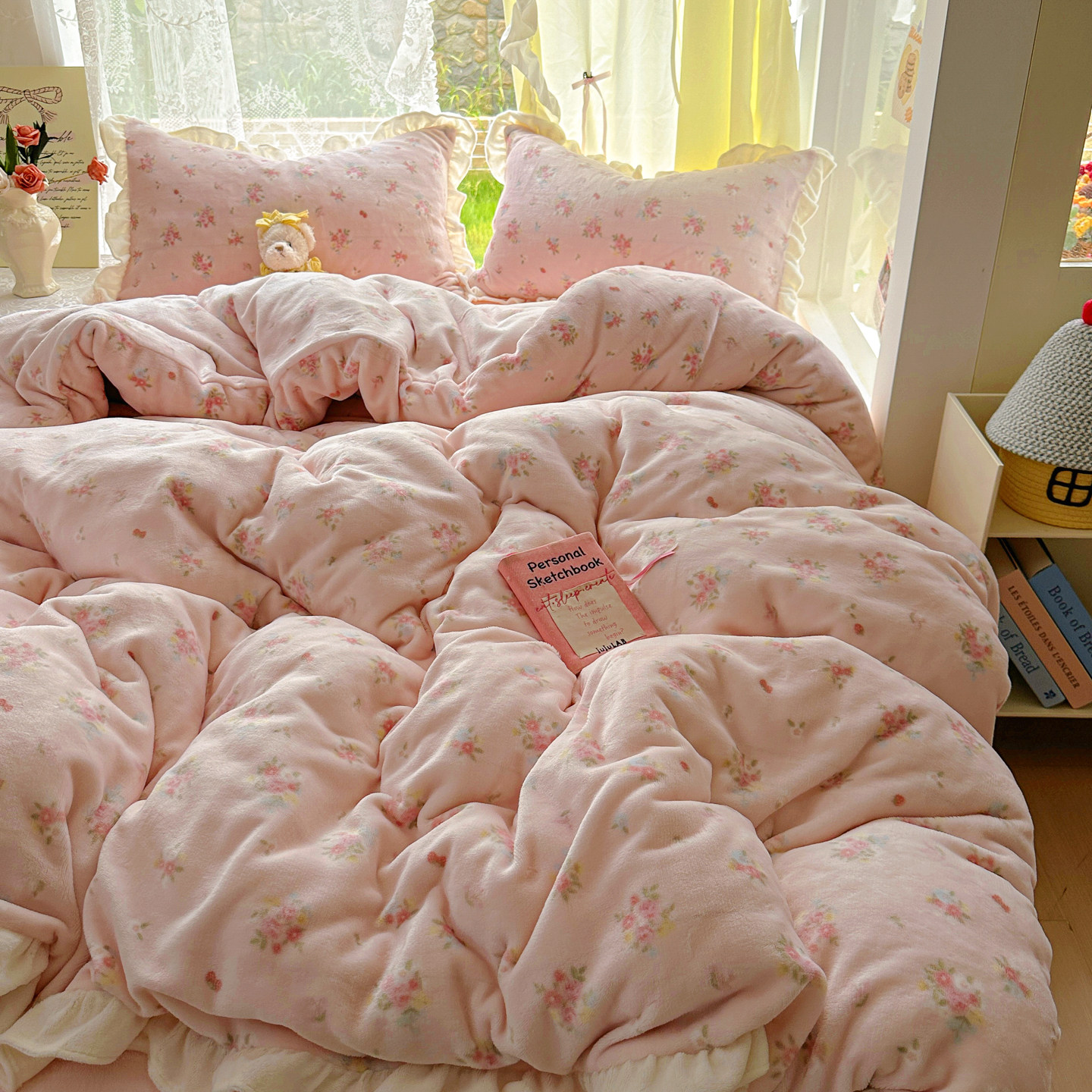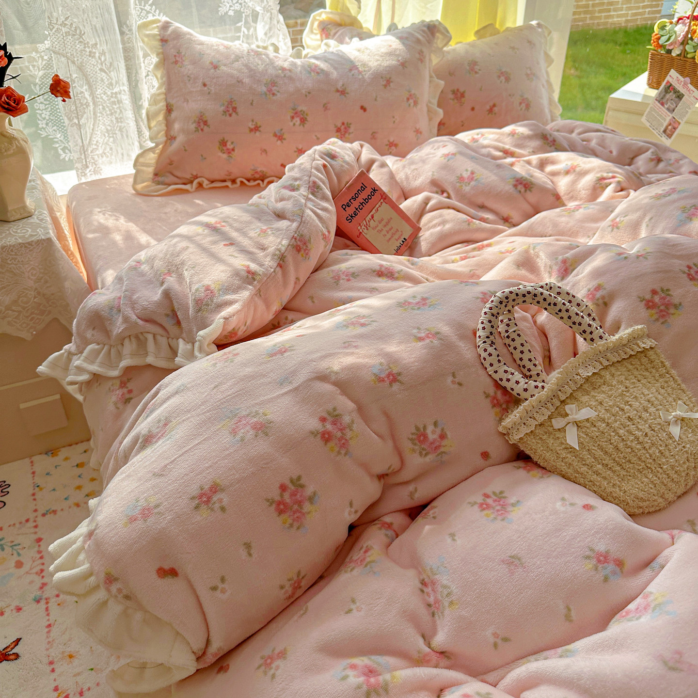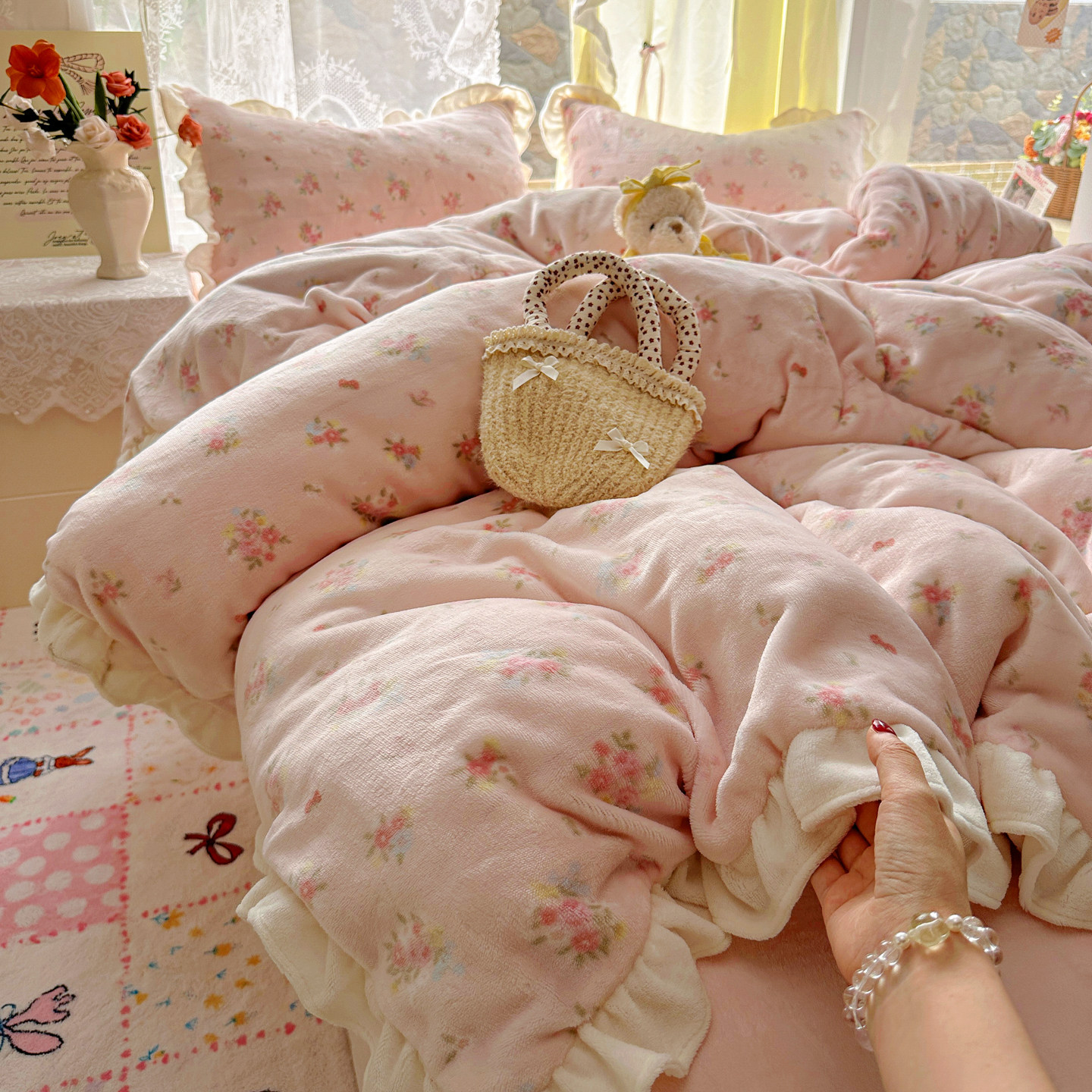 A类韩系花边牛奶绒四件套高克重秋冬季加厚珊瑚绒被套宿舍三件套4