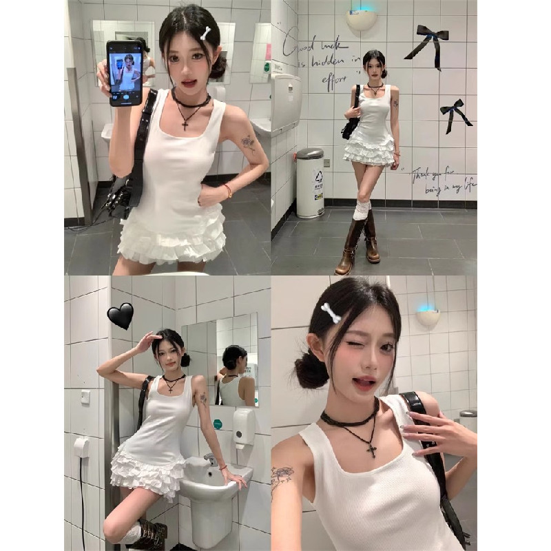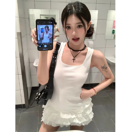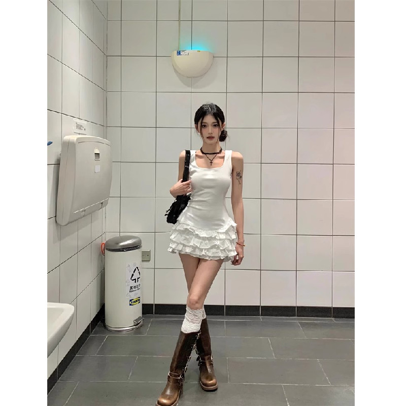 白色辣妹方领无袖背心连衣裙2025新款爆款收腰显瘦A字吊带短裙女