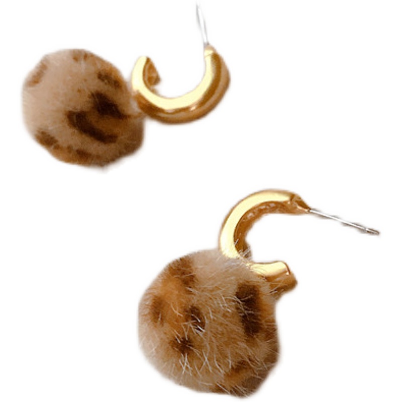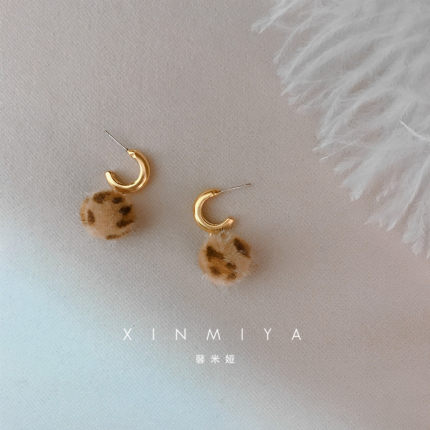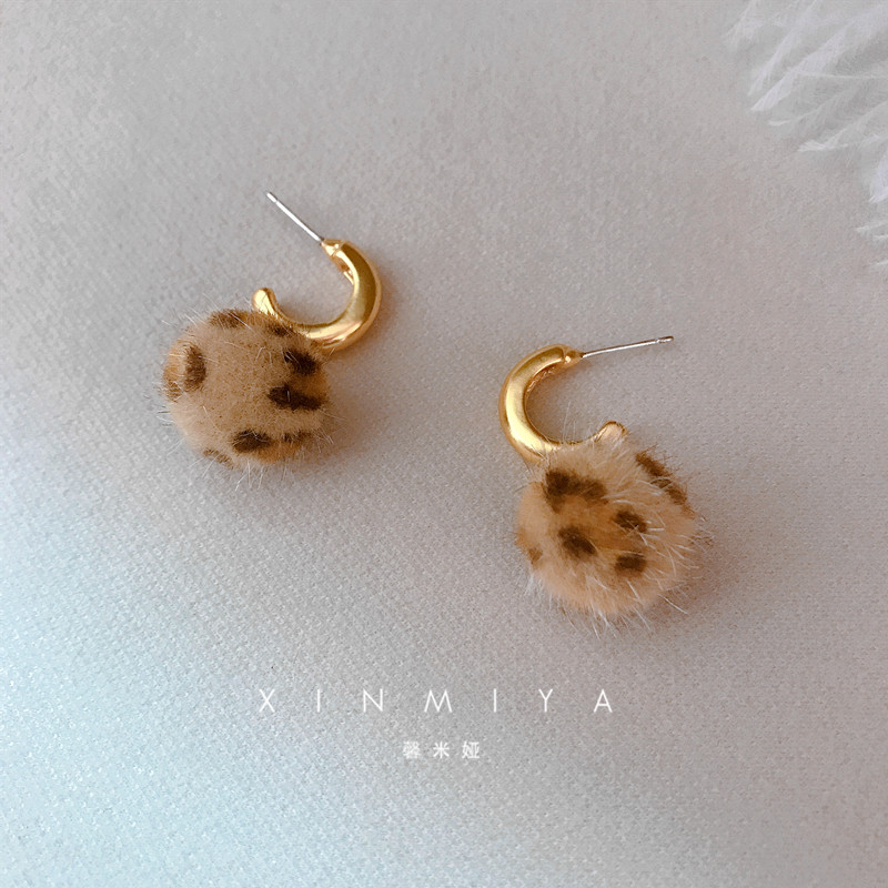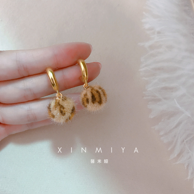 韩国气质网红豹纹毛绒耳环女毛毛纯银耳钉高级感轻奢百搭毛球耳圈