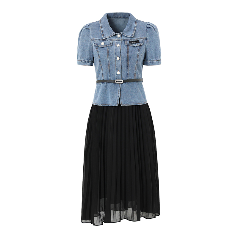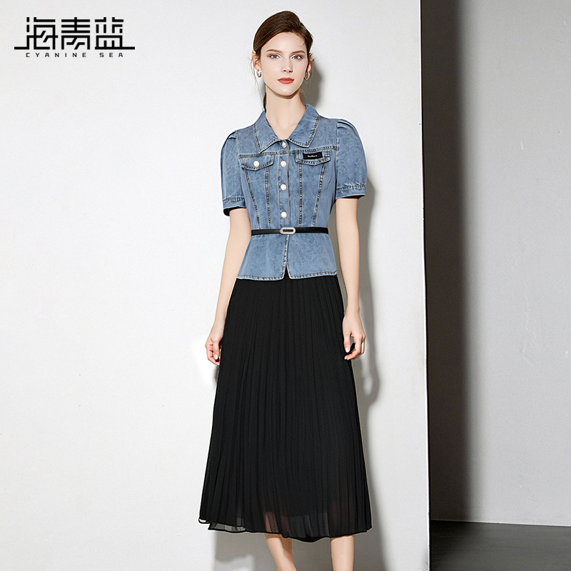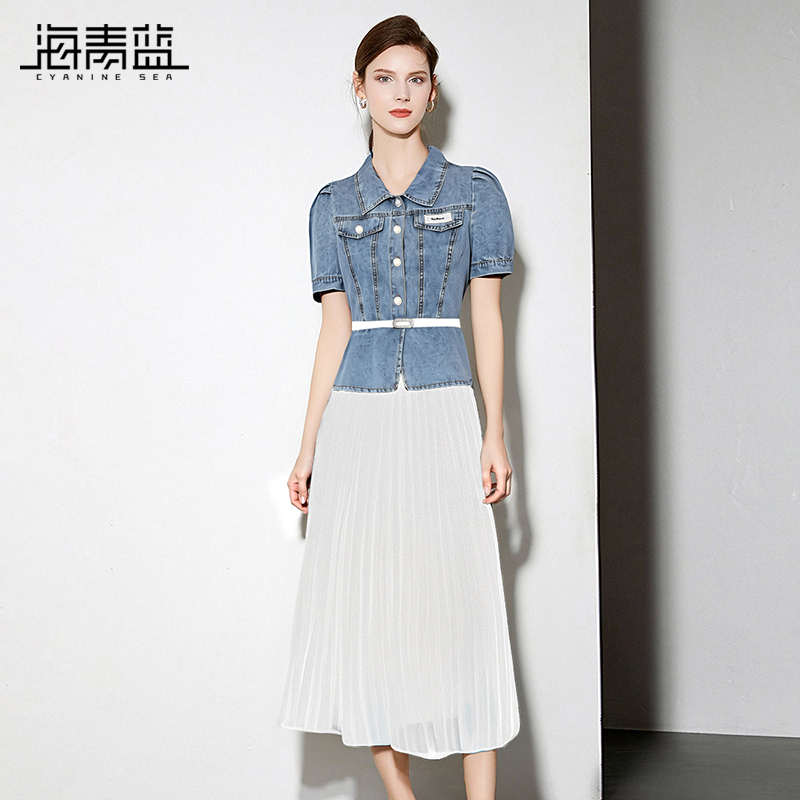 海青蓝 短袖中长款牛仔连衣裙25年新款夏季时尚拼接百褶半身裙女