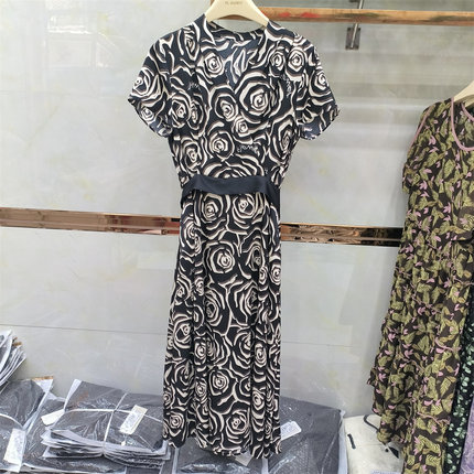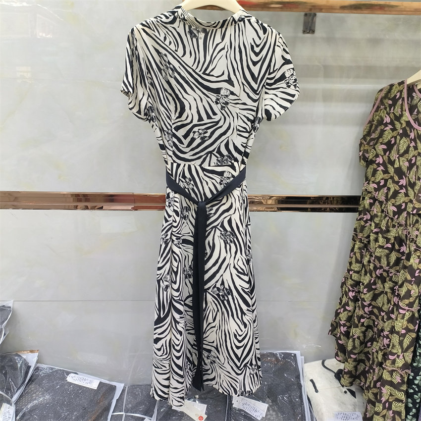 天利百瑞30-1当季新品女士高档中长款V领连衣裙气质短袖裙子流行