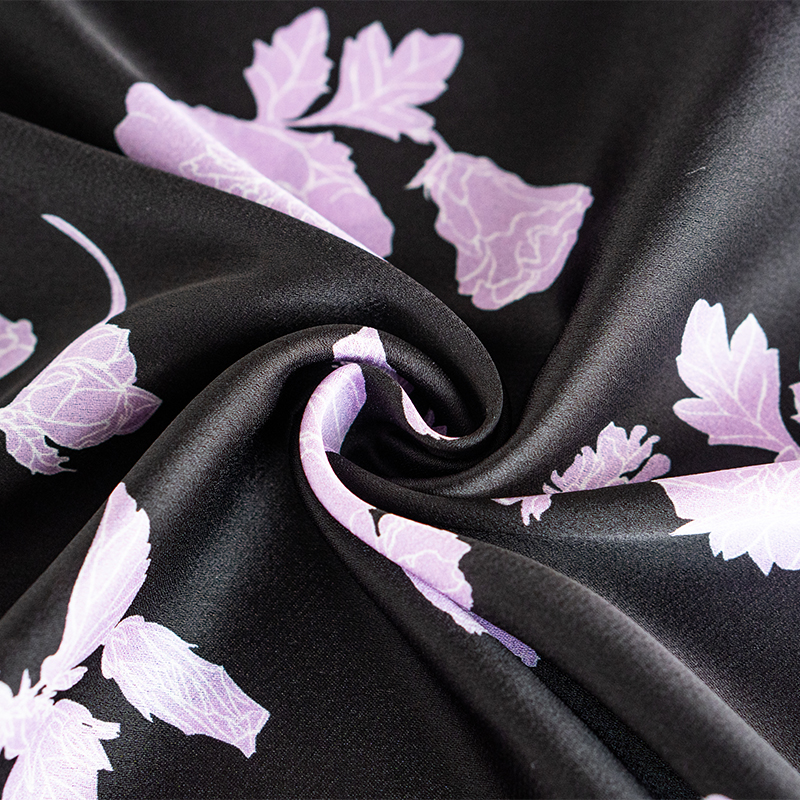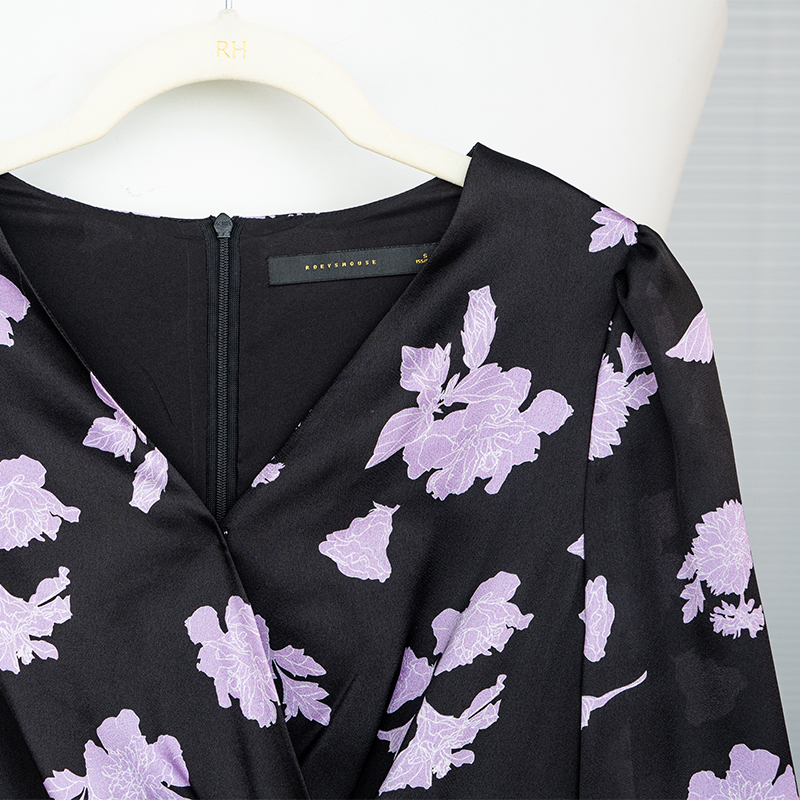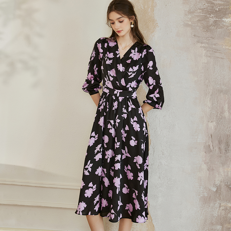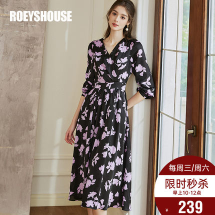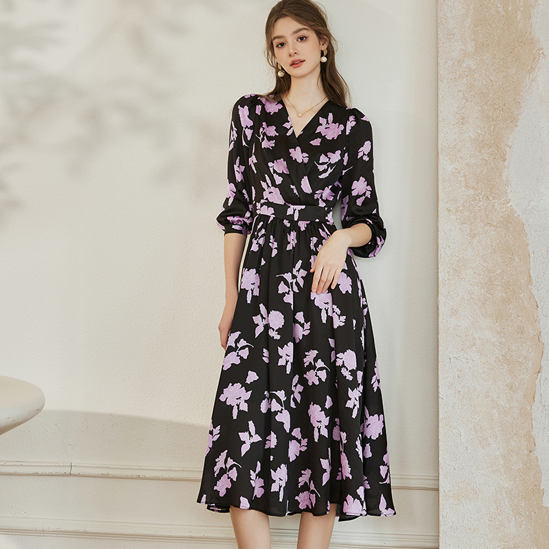 罗衣气质印花收腰连衣裙女2025春装新款时尚V领缎面大摆裙子10027