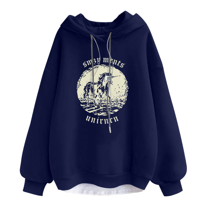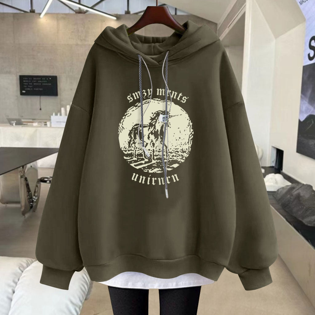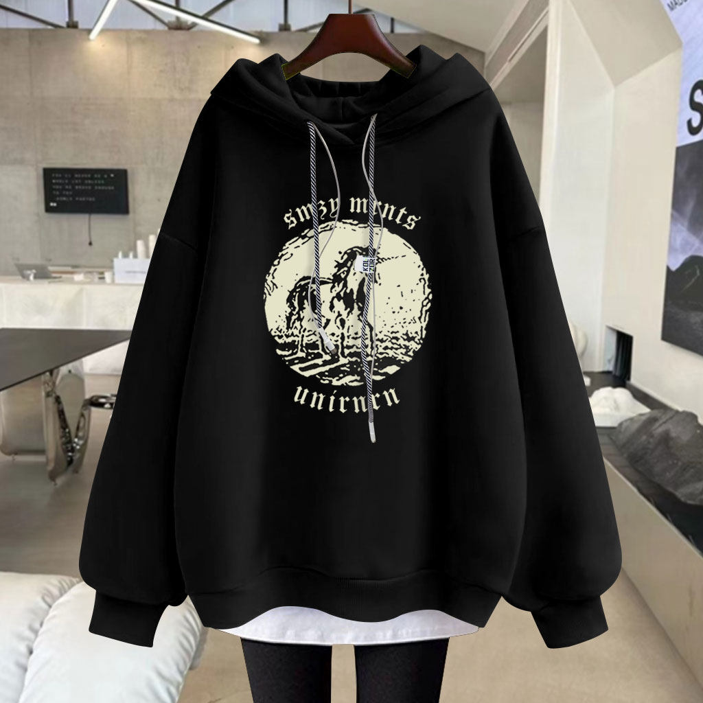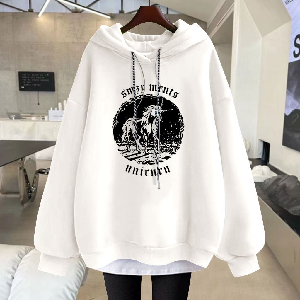 2025春秋冬季新款独角兽中长款加绒加厚宽松套头长袖连帽卫衣女潮