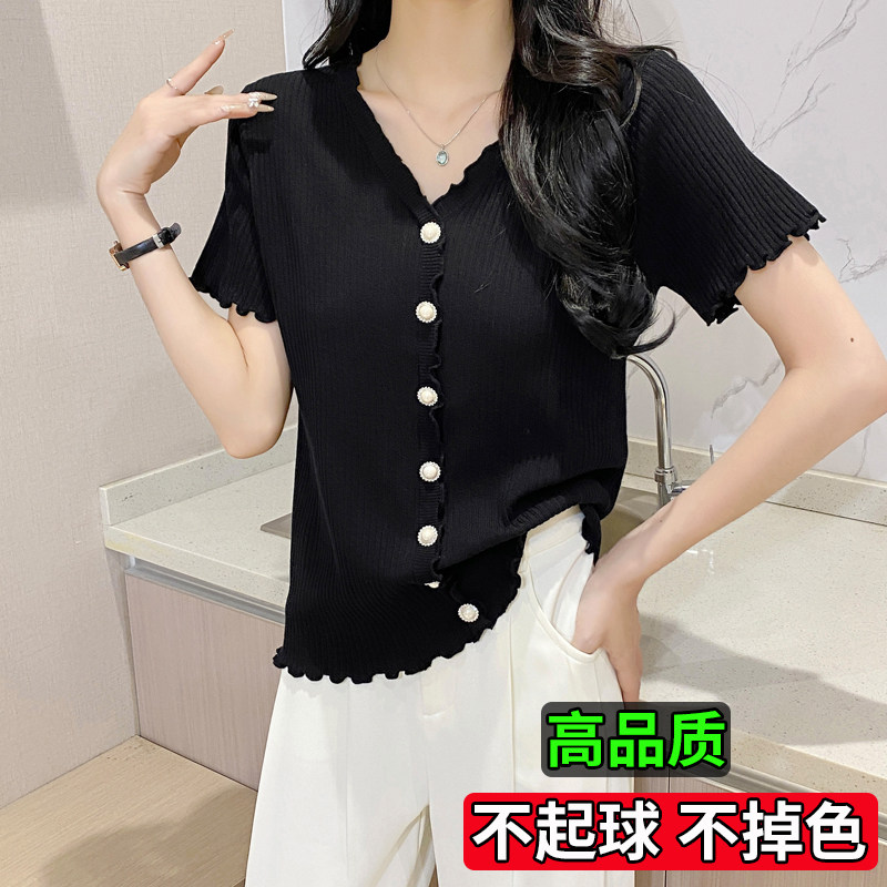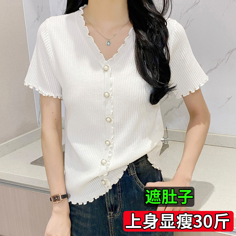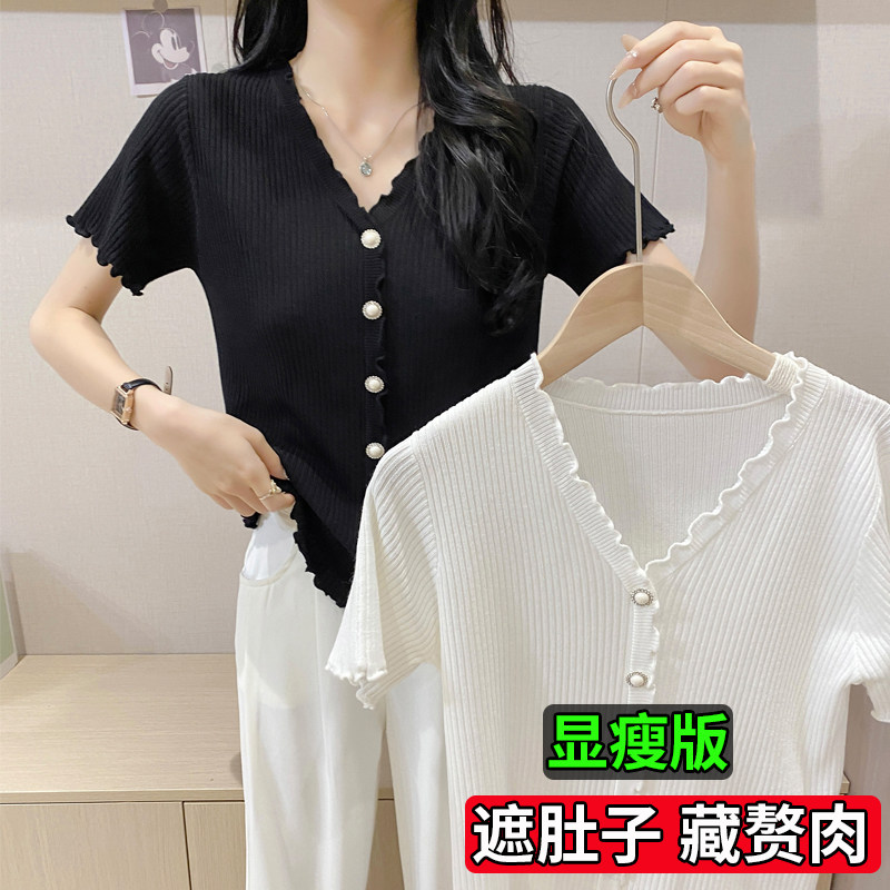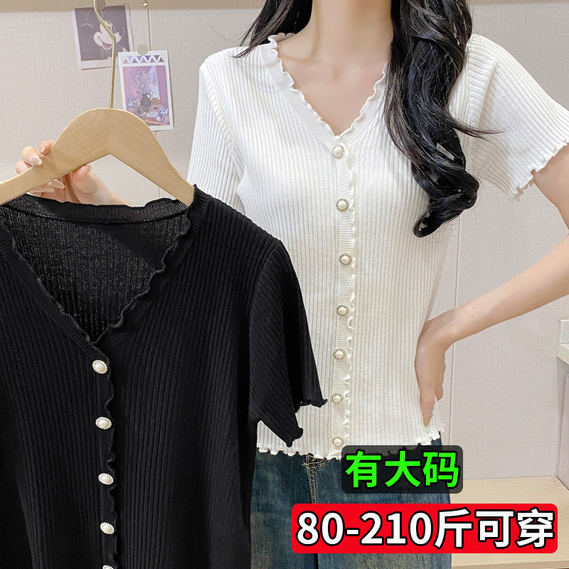加肥加大码胖mm冰丝针织短袖女夏V领T恤小外搭罩衫开衫小香风上衣