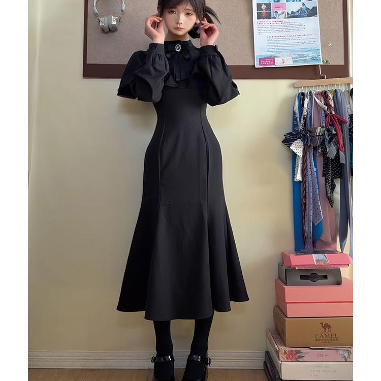 法式赫本风黑色斗篷连衣裙女春季2025新款高级感收腰包臀鱼尾长裙
