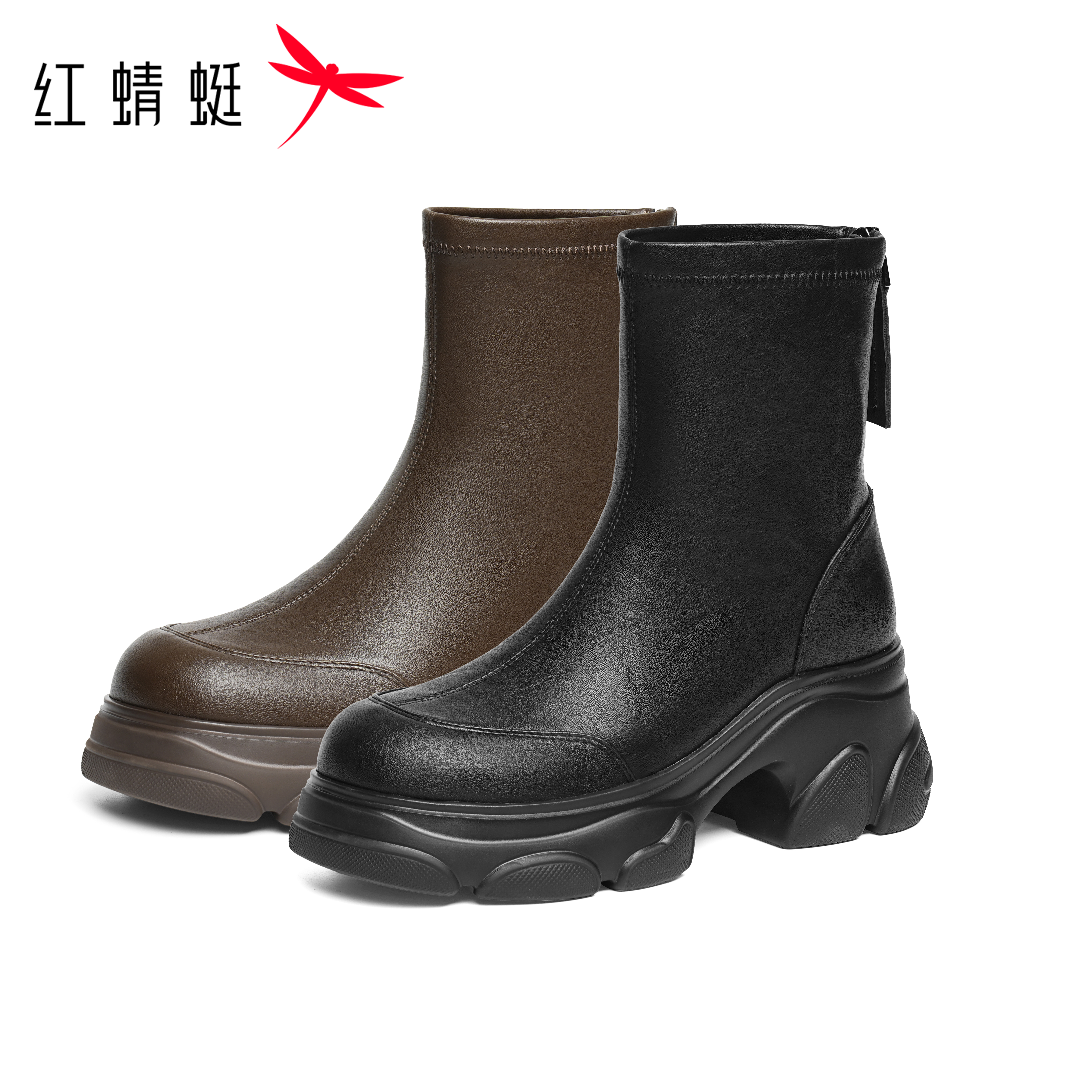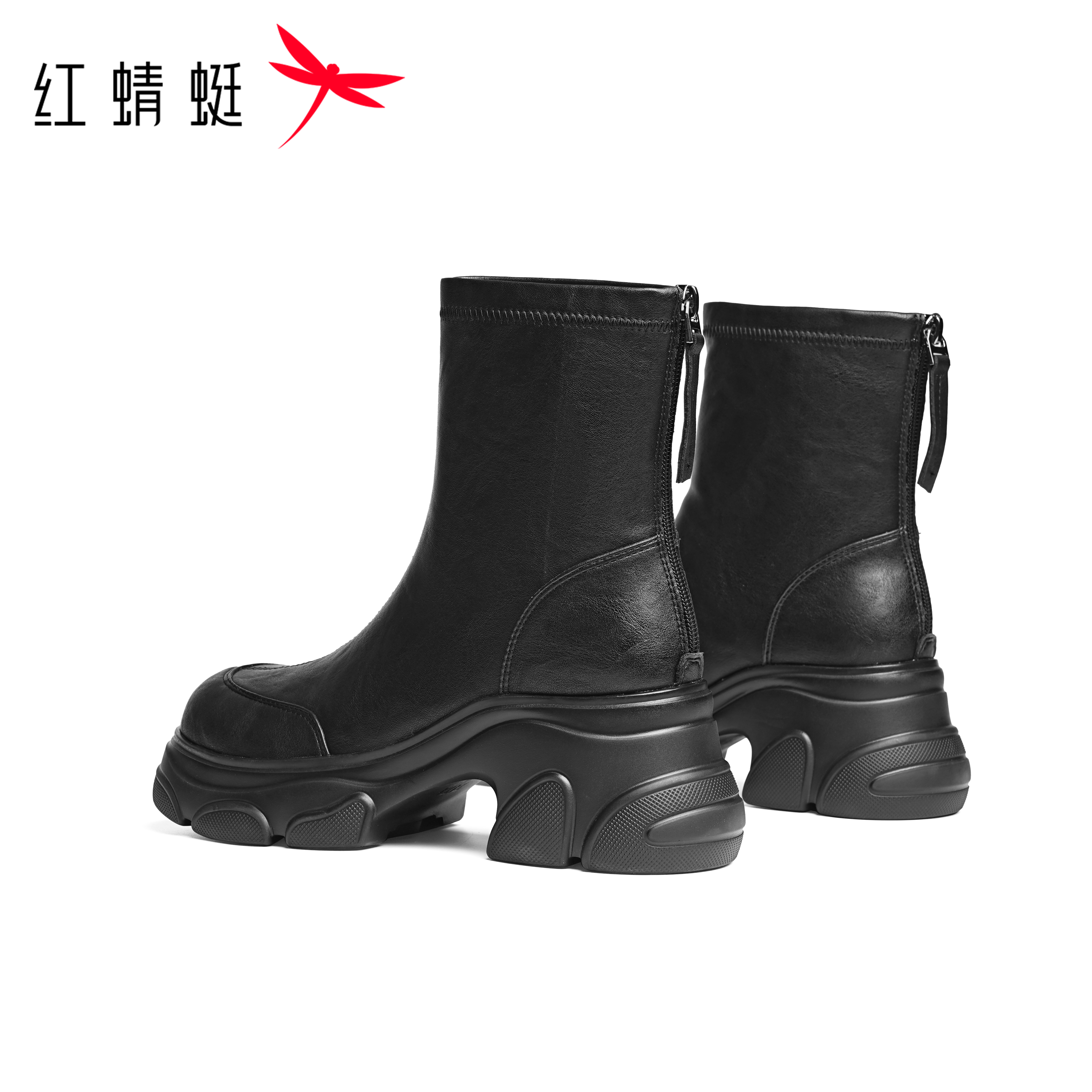 红蜻蜓厚底短靴女黑色加绒弹力靴