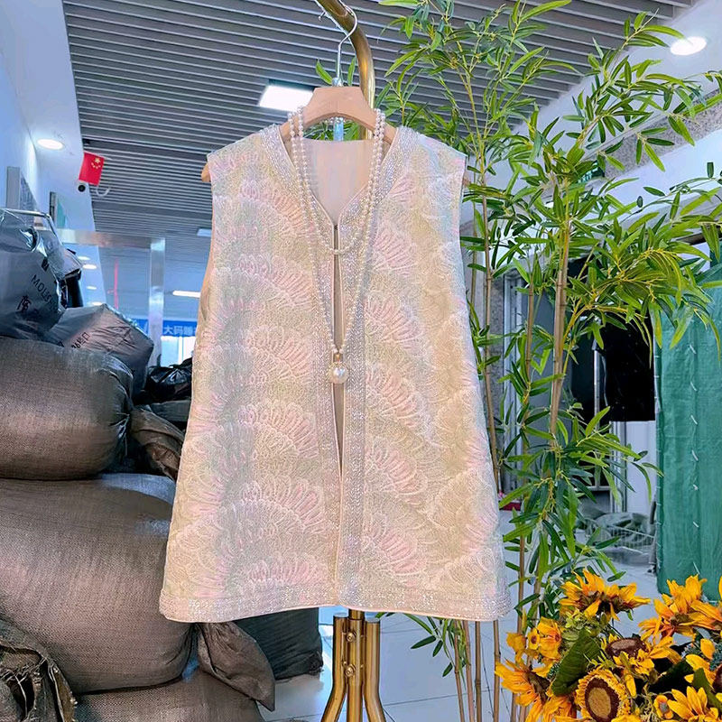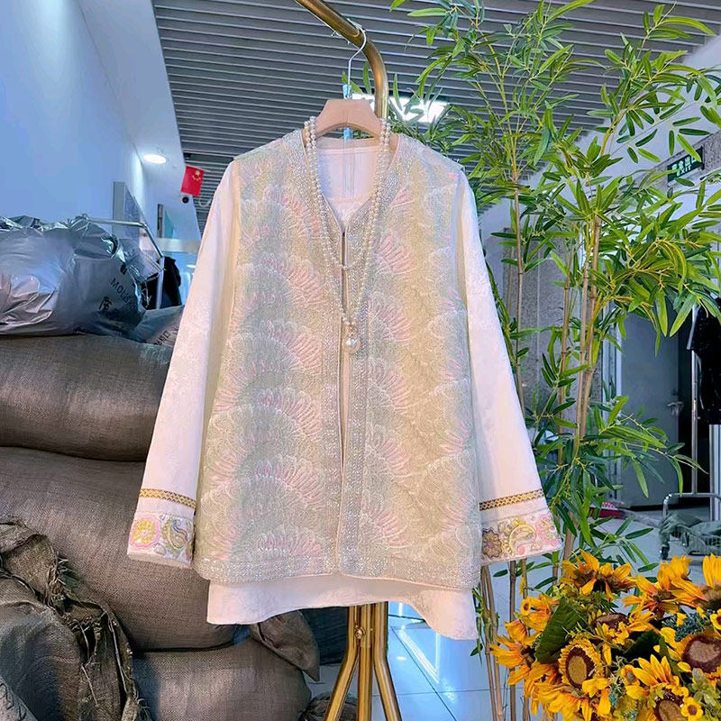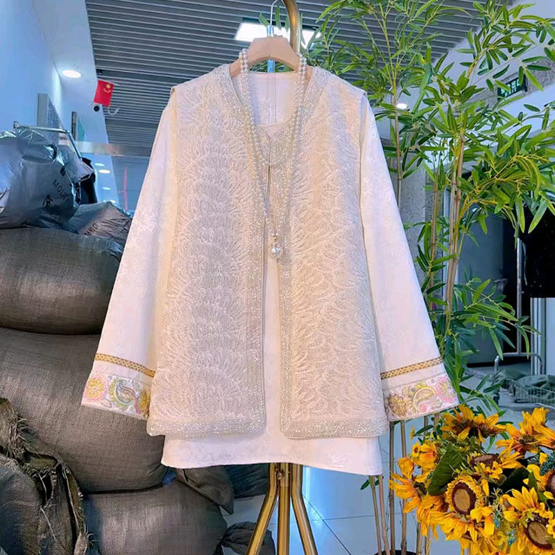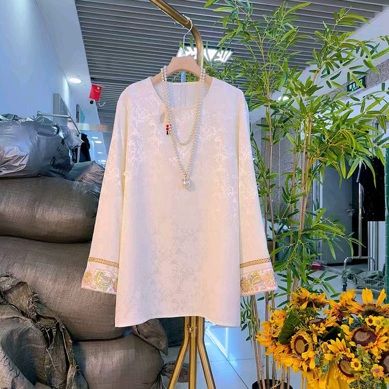 加大码女装V领花朵马甲大码女装韩版减龄新中式拼色袖口长袖小衫
