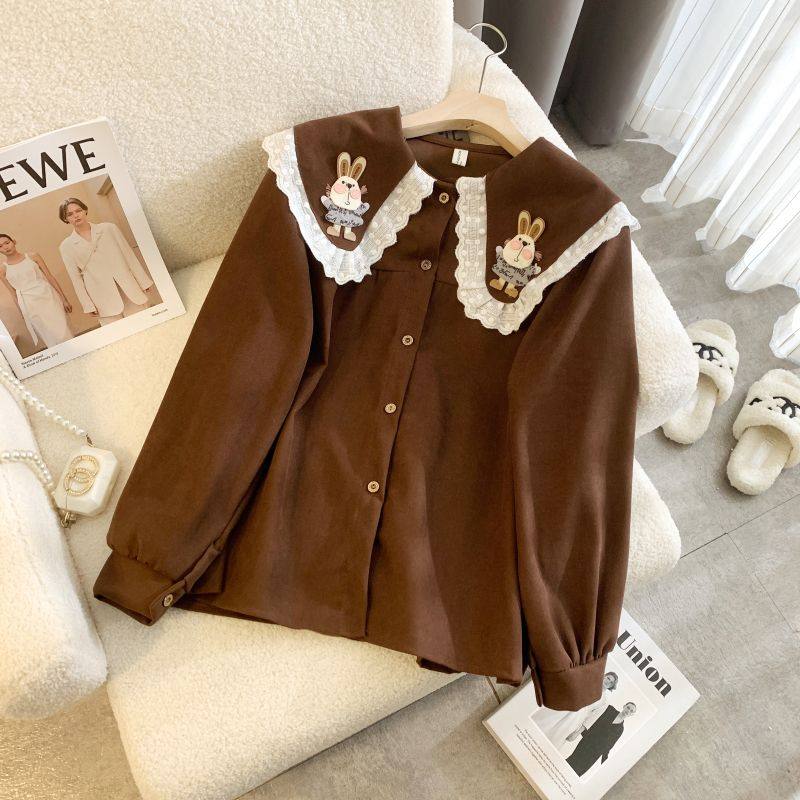 胖MM300斤春季森系学院风娃娃领小兔子贴布大码宽松长袖衬衫衬衣2