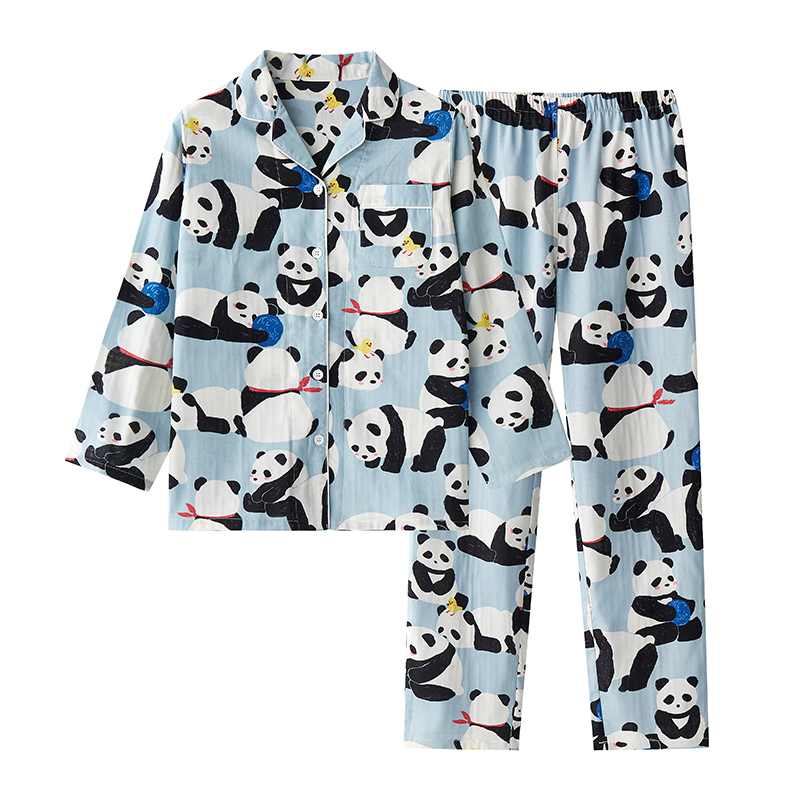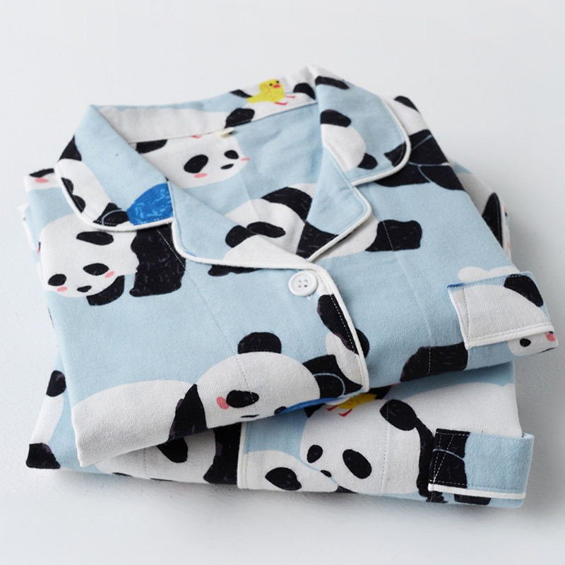 日系春夏女士纯棉绒布翻领熊猫情侣套装男全棉长袖家居服睡衣套装