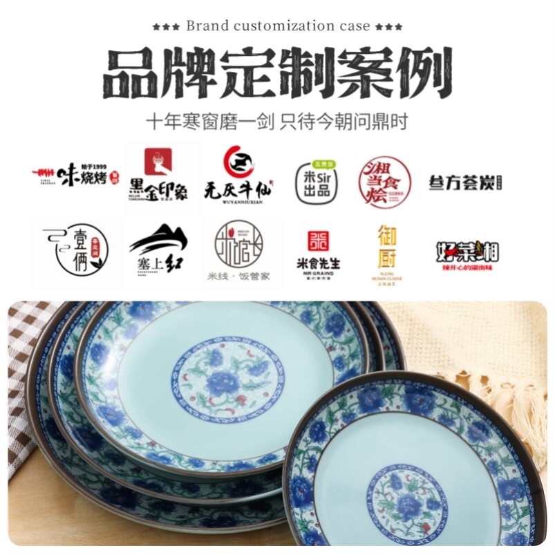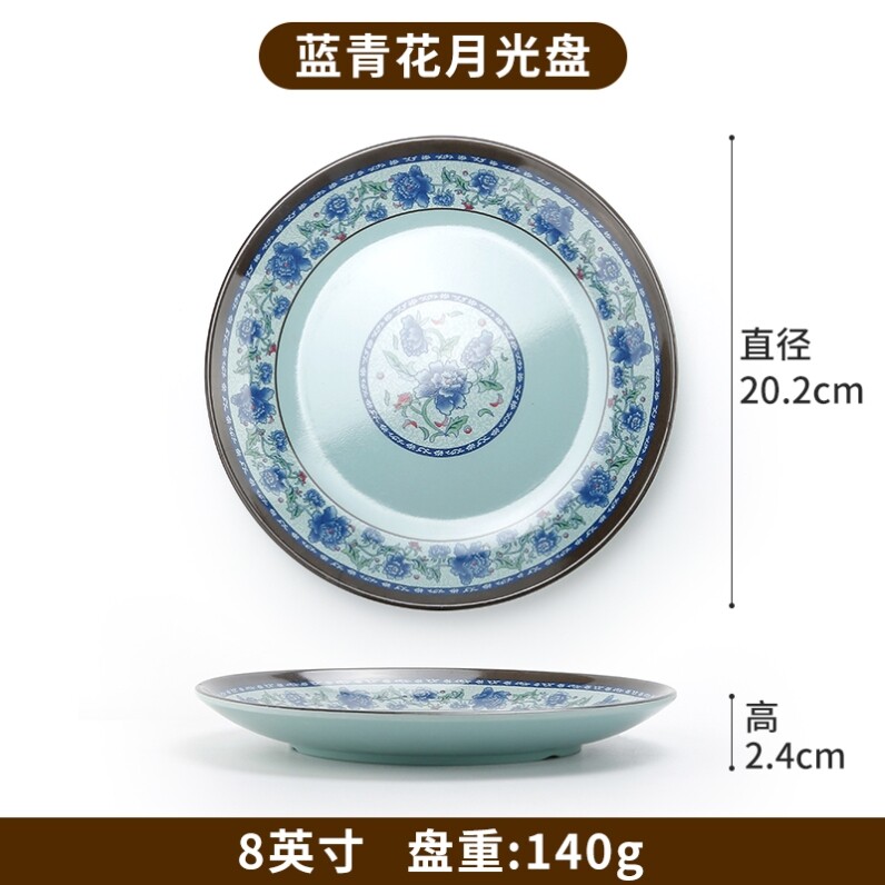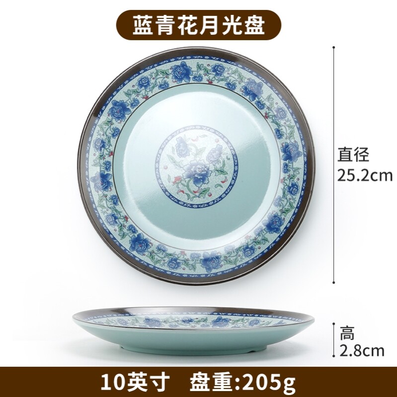 蓝青花密胺盘子商用圆形烧烤专用盘饭店凉菜盘子火锅配菜盘小吃碟