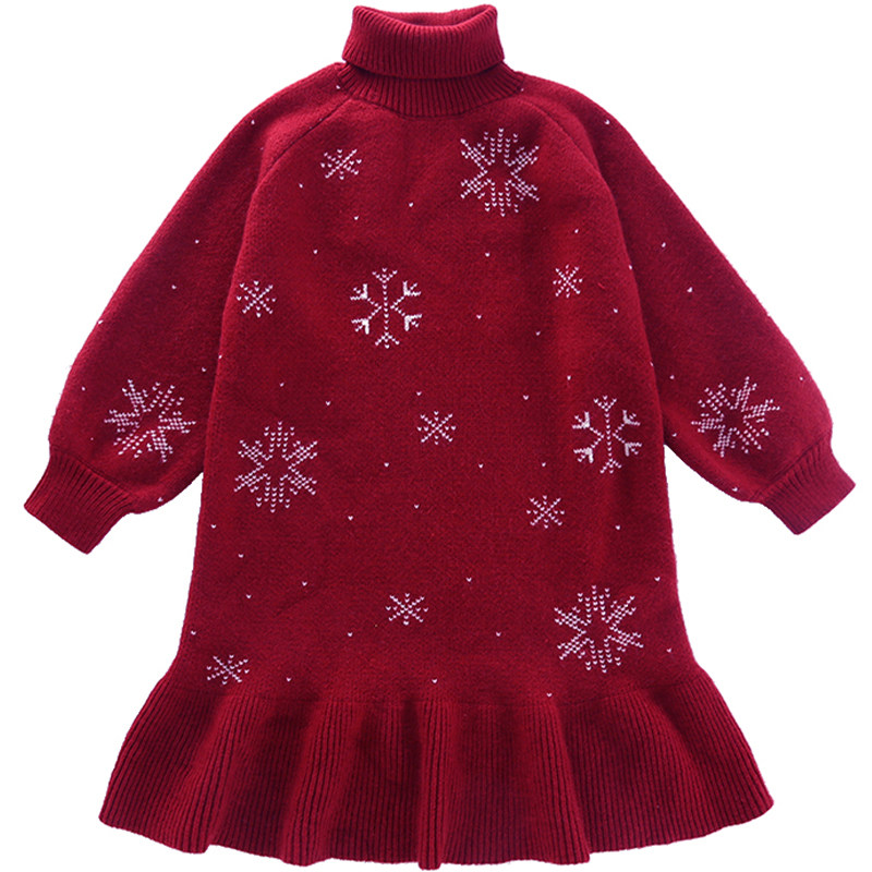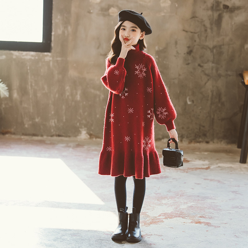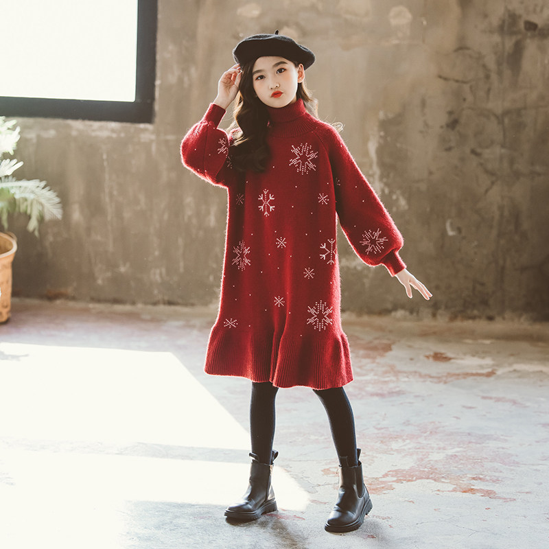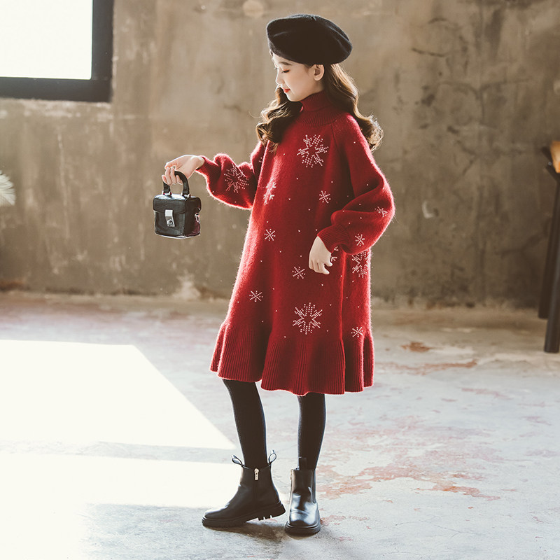 女童毛衣连衣裙2024新款秋装加厚宝宝针织衫中大童秋冬高领长裙子