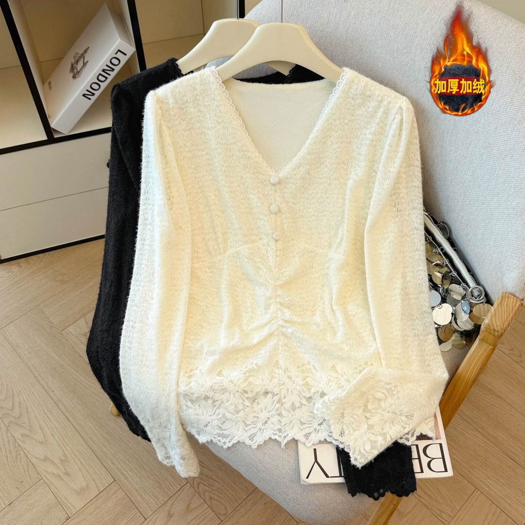 V领蕾丝拼接加绒加厚衬衫女秋冬2025新款宽松显瘦百搭长袖打底衫