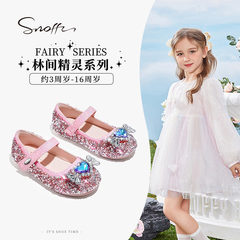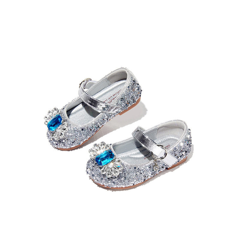 斯纳菲春秋季新款女童皮鞋爱莎蓝公主鞋儿童水晶鞋演出礼服银色鞋