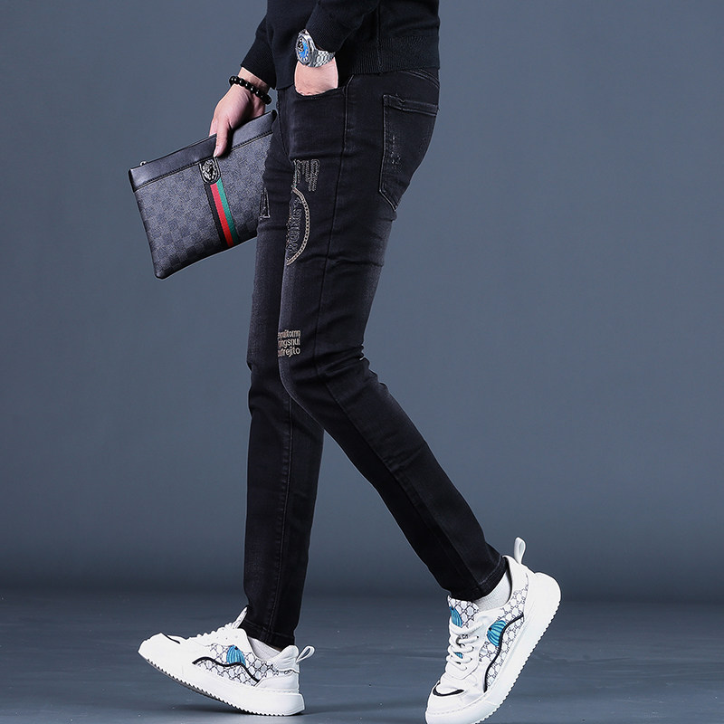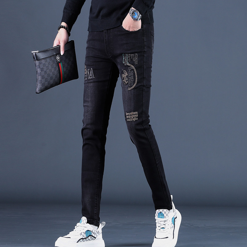 秋季款2025新款紧身刺绣牛仔裤男士修身加绒潮牌黑色小脚裤子潮