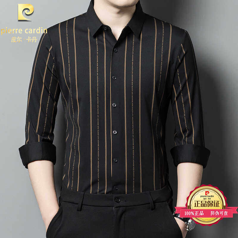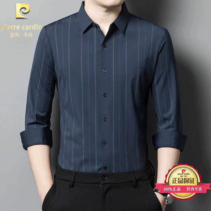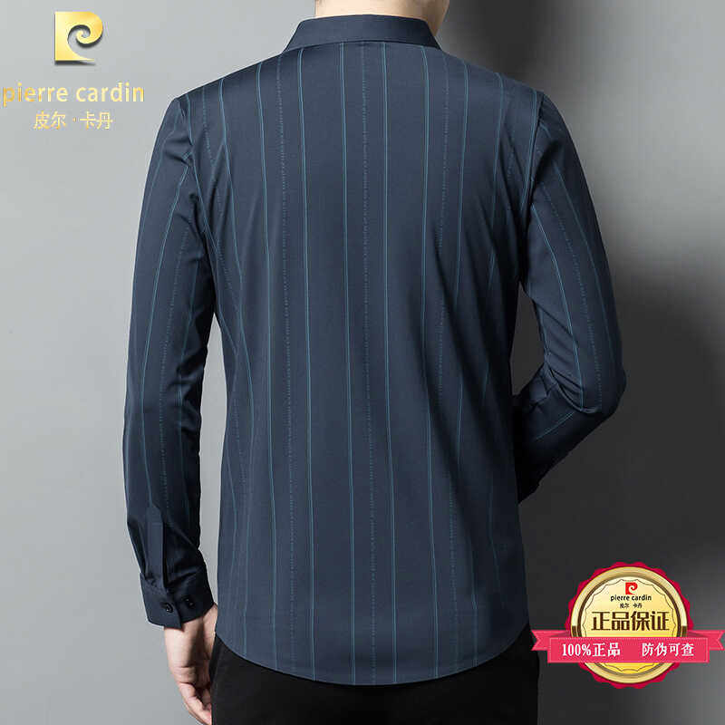 皮尔卡丹桑蚕丝无痕长袖衬衫男士中年商务休闲竖条纹免烫弹力衬衣